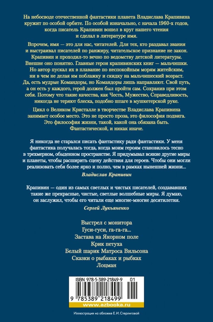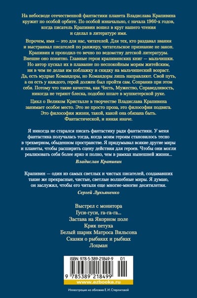 Vladislav Krapivin's planet circles in a special orbit in the firmament of Russian fiction. On special initially, since the early 1960s, when the writer Krapivin entered the circle of our reading and made a name in literature (readers of the older generation remember the emotional explosion after reading a small story "I go to meet my brother" in the collection "Fiction 1963"). The name, however, is for us, the readers. For those who gave out titles and ranked the writers, reader's recognition is not a law. Krapivin was always in the department of children's literature. Outwardly, it is understandable. The main characters of Krapivinsky books - boys. But the author let them sail the troubled seas of life, in anything not making them indulgence and discount for boyish age. Yes, there are wise Commanders, but Commanders only guide. The hero had to make his own way, and everyone has one. And in doing so, he had to save himself. Because such qualities as Honor, Courage, Justice, never lose their luster, like a sword in a musketeer's hand. The cycle of the Great Crystal in the works of Vladislav Krapivin takes a special place. The works included in the cycle, written at different times, but connected by a single thought - it is not just prose, it is a philosophy of the feat. This is a philosophy of life, such as it must be. Fantastic, and in no other way.
