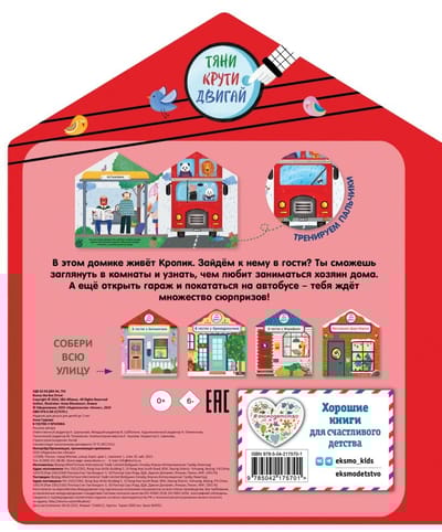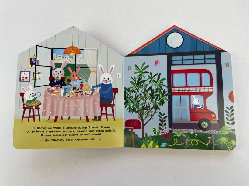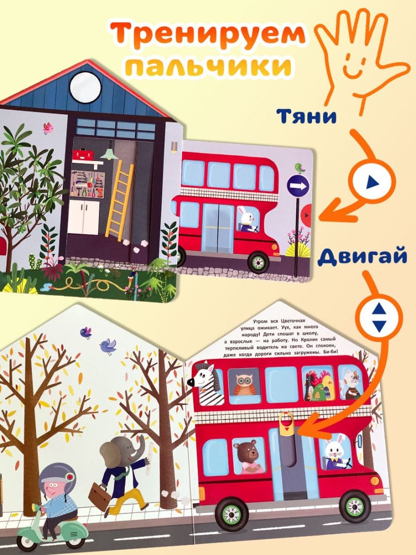 This interactive book-toy is full of surprises: your little one can explore the rooms of the house and discover what the friendly owner likes to do. They can also open the garage and ride the bus.