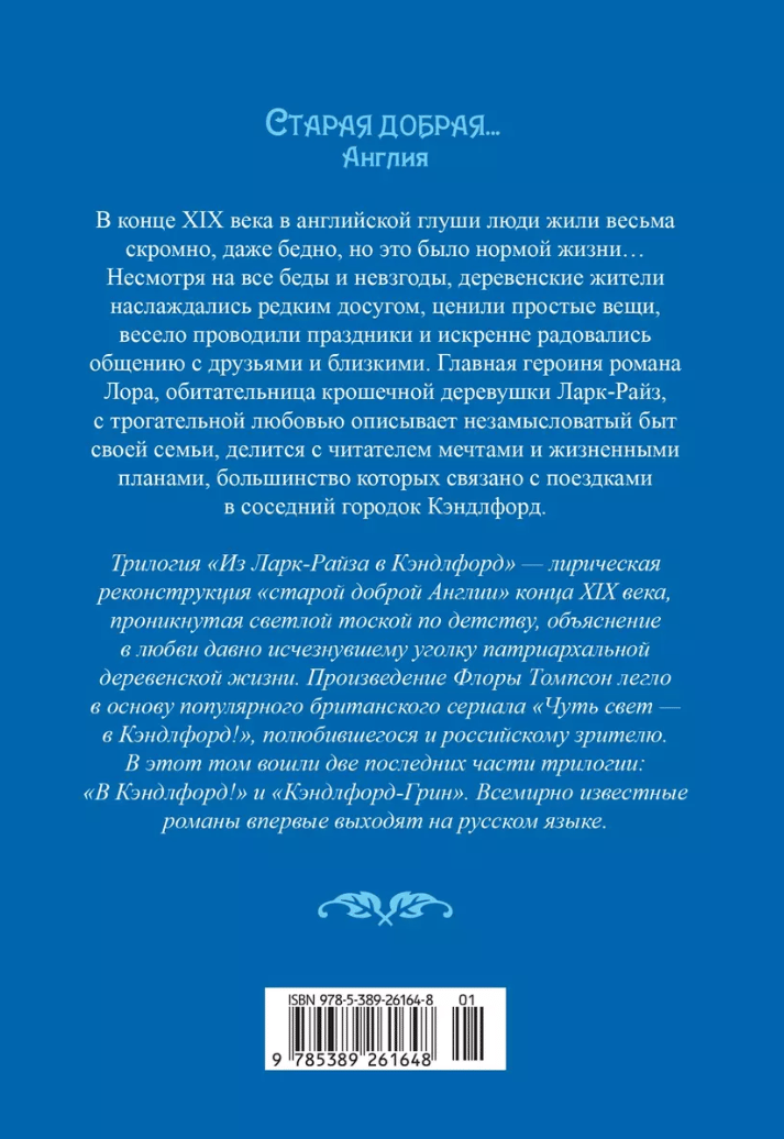 The autobiographical trilogy "From Lark Rise to Candleford" is a nostalgic ode to life in provincial Victorian England, told from the perspective of a girl named Laura, who grew up in the village of Lark Rise in northern Oxfordshire and then, as a teenager, got a job at the post office in the nearby town of Candleford Green. These half-lyrical, half-documentary memoirs are charming in the sincerity of the story and the simplicity of village customs, which at times seem naive, and therefore even more touching. This volume includes the second and third parts of the trilogy.