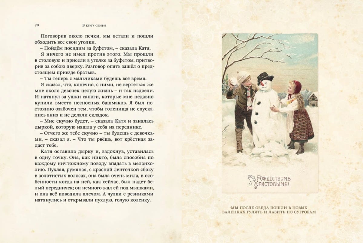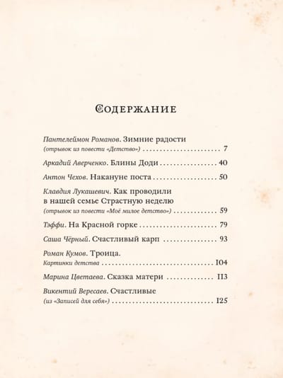 The book includes stories by A.P. Chekhov, Arkady Averchenko, Sasha Cherny, Teffi, Marina Tsvetaeva, and other remarkable writers of the 19th and 20th centuries about family traditions and holidays, about home and parents—through the eyes of a child.