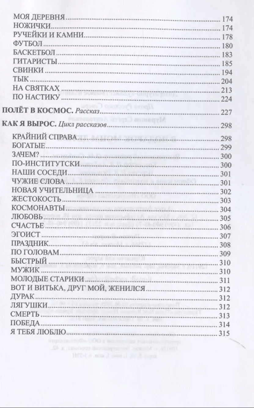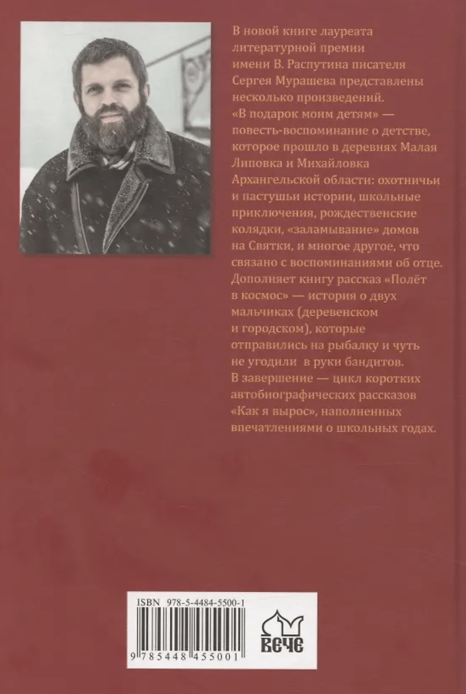 The new book by Sergei Murashev, winner of the V. Rasputin Literary Prize, features several works. "As a Gift to My Children" is a memoir about his childhood in the villages of Malaya Lipovka and Mikhailovka in the Arkhangelsk region: stories of hunting and shepherding, school adventures, Christmas carols, the "breaking down" of houses at Christmastide, and much more, all connected to memories of his father. The book is complemented by the story "Flight into Space"—the tale of two boys (one from the countryside, one from the city) who went fishing and nearly fell into the hands of bandits. Finally, there's a series of short autobiographical stories, "How I Grew Up," filled with impressions of his school years.