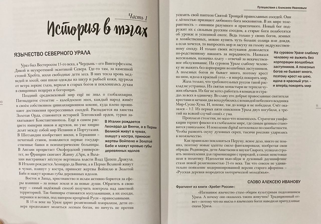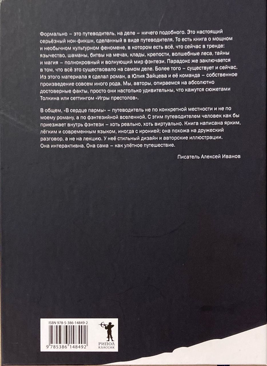 Formally, it is a guidebook, but in reality, it is nothing of the sort. This is a truly serious non-fiction, made in the form of a guidebook. That is, a book about a powerful and unusual cultural phenomenon, which has everything that is trendy now: paganism, shamans, sword fights, treasures, fortresses, magical forests, secrets and magic - a full-blooded and exciting fantasy world. The paradox is that all this really existed. Moreover, it still exists. I made a novel out of this material, and Yulia Zaitseva and her team - their own work of a completely different kind. We, the authors, rely on absolutely reliable facts, they are just so amazing that they seem like Tolkien's plots or the setting of "Game of Thrones". In general, "In the Heart of Parma" is a guide not to a specific location and not to my novel, but to a fantasy universe. With this guide, a person comes inside a fantasy, either in reality or virtually. The book is written in a bright, light and modern language, sometimes with irony; it is like a friendly conversation, not a lecture. It has a stylish design and the author's illustrations. It is interactive. It is like a mind-blowing journey.