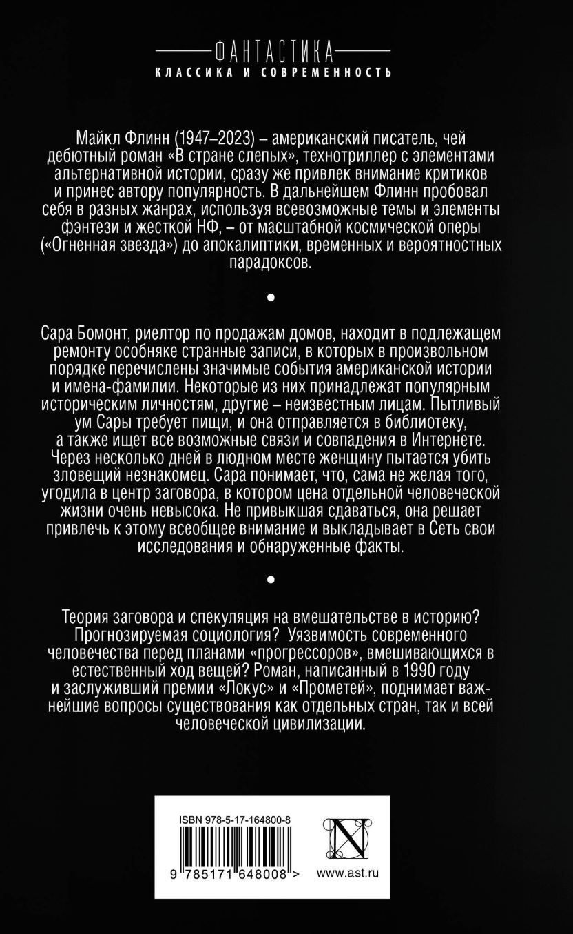 Sarah Beaumont, a realtor selling houses, finds strange records in the mansion to be repaired, in which, in random order, significant events in American history and surnames are listed. Some of them belong to popular historical figures, others to unknown persons. Sarah's inquiring mind demands food, and she heads to the library while also searching for all possible connections and coincidences online. A few days later, in a crowded place, a woman tries to kill a sinister stranger. Sarah realizes that, unwittingly, she has fallen into the center of a conspiracy in which the cost of an individual human life is very low. Unaccustomed to giving up, she decides to attract everyone’s attention, and posts her research and discovered facts online.