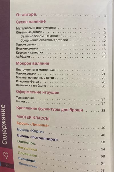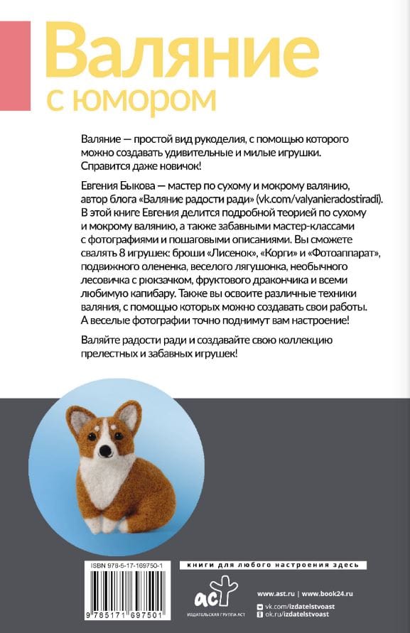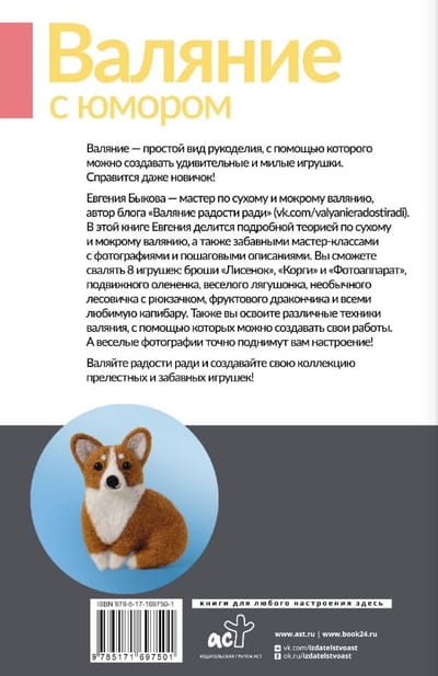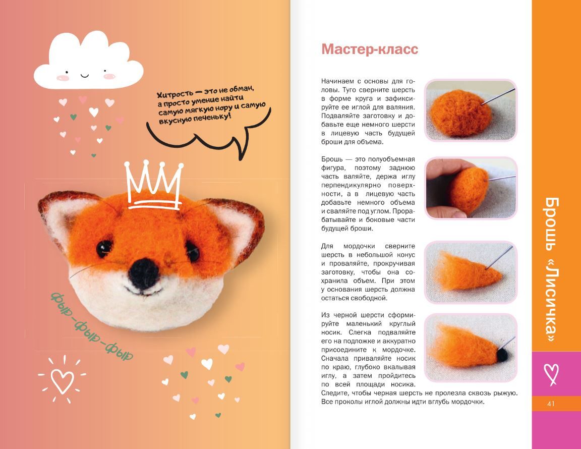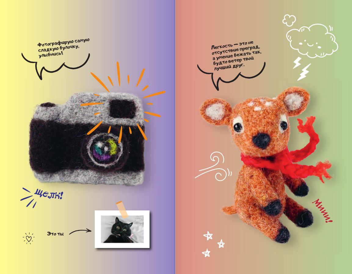This book presents 8 master classes on felting cute and funny toys. You will be able to create brooches "Fox", "Corgi", "Camera", a moving deer, a funny frog, an unusual forest spirit with a backpack, a fruit dragon and everyone's favorite capybara! You will also master various felting techniques, with the help of which you can create your own works. And funny photos will definitely cheer you up!