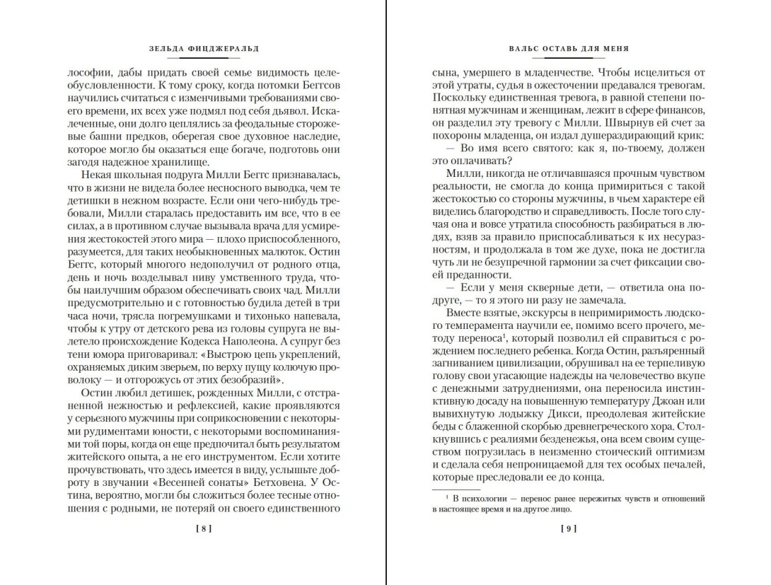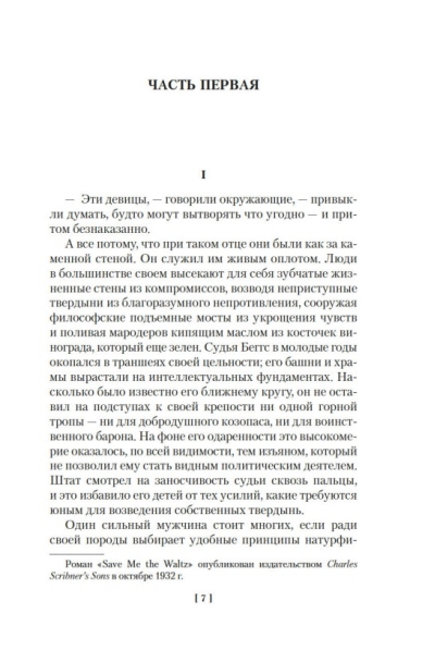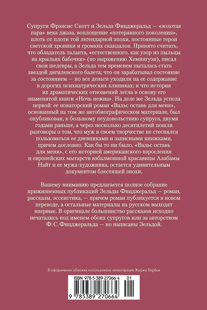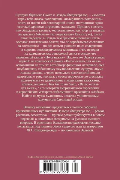 Francis Scott and Zelda Fitzgerald were the "golden couple" of the Jazz Age, the embodiment of the "Lost Generation," a quintessential part of that legendary era, constant subjects of gossip columns and high-profile scandals. It is generally accepted that the possessor of a talent "as natural as the pollen pattern on a butterfly's wings" (as Hemingway put it) wrote his masterpieces while Zelda, meanwhile, tried to become a star of Diaghilev's ballet; that he earned fortune after fortune, but all the money went toward her upkeep in expensive psychiatric clinics; and that the story of their dramatic relationship formed the basis for his famous book, Tender Is the Night. In fact, Zelda got there first: her groundbreaking novel, Save the Waltz for Me, based on the same autobiographical material, was published, much to her husband's dismay, two years earlier. Decades later, rumors began swirling that her husband had not hesitated to use her diaries and notebooks verbatim in his work. Regardless, Save the Waltz for Me, with its story of American coming-of-age and the European ordeals of the eccentric beauty Alabama Knight and her artist husband, remains a remarkable document of a brilliant era.