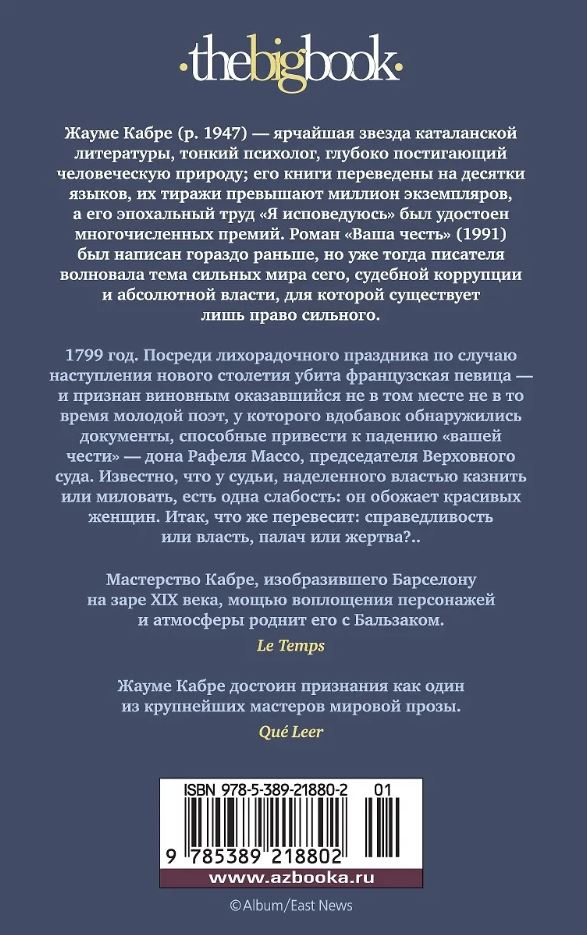 Jaume Cabré (b. 1947) is the brightest star of Catalan literature, a screenwriter, philologist, subtle psychologist with a deep understanding of human nature; his books have been translated into dozens of languages, their circulation exceeds a million copies, and his epochal work "I Confess" has been awarded numerous prizes. The novel "Your Honor" (1991) was written much earlier, but even then the writer was concerned with the theme of the powerful, judicial corruption and absolute power, for which only the right of the strong exists. Winter 1799. In Barcelona, there are prolonged rains, the city seems paralyzed, but social life is in full swing. It seems that the aristocrats have only one concern: how to celebrate the onset of the new 19th century. The Te Deum is performed in the cathedral, a series of receptions unfold in the luxurious halls... However, the festive atmosphere is overshadowed by the strange murder of a French singer - and a young poet is arrested, accidentally finding himself in the wrong place at the wrong time. He is unconditionally found guilty, especially since documents are found in his possession that could lead to the downfall of "your honor" - Don Raphel Massot, the President of the Supreme Court. It is known that the judge, endowed with the power to execute or pardon, has one weakness: he adores beautiful women. So what will prevail: justice or power, the executioner or the victim, "I didn't kill her!" of one or "I didn't want it" of the other?..