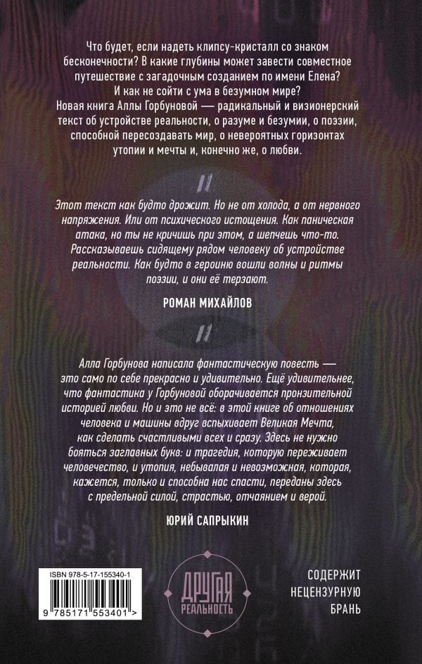 What happens when you wear a clip-crystal with an infinity sign? In what depths can lead a joint journey with a mysterious creature named Elena? And how not to go crazy in a crazy world? Alla Gorbunova's new book is a radical and visionary text about the structure of reality, about reason and madness, about poetry that can recreate the world, about the incredible horizons of utopia and dreams and, of course, about love.