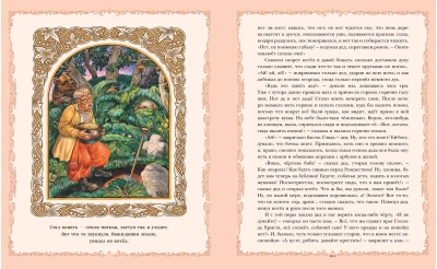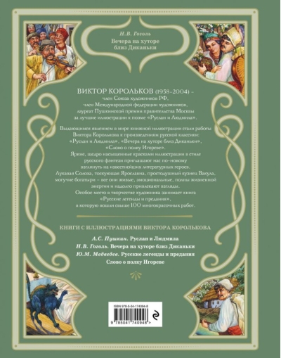 A gift-size edition in superb printing. Hardcover with raised elements and partial varnish. Colored endpapers. Thick paper with a colored border along the page edges. Clear, large, and easy-to-read font. Unusual, vibrantly colored illustrations in the style of Russian fantasy were created by the remarkable Russian artist and Pushkin Prize winner Viktor Korolkov.