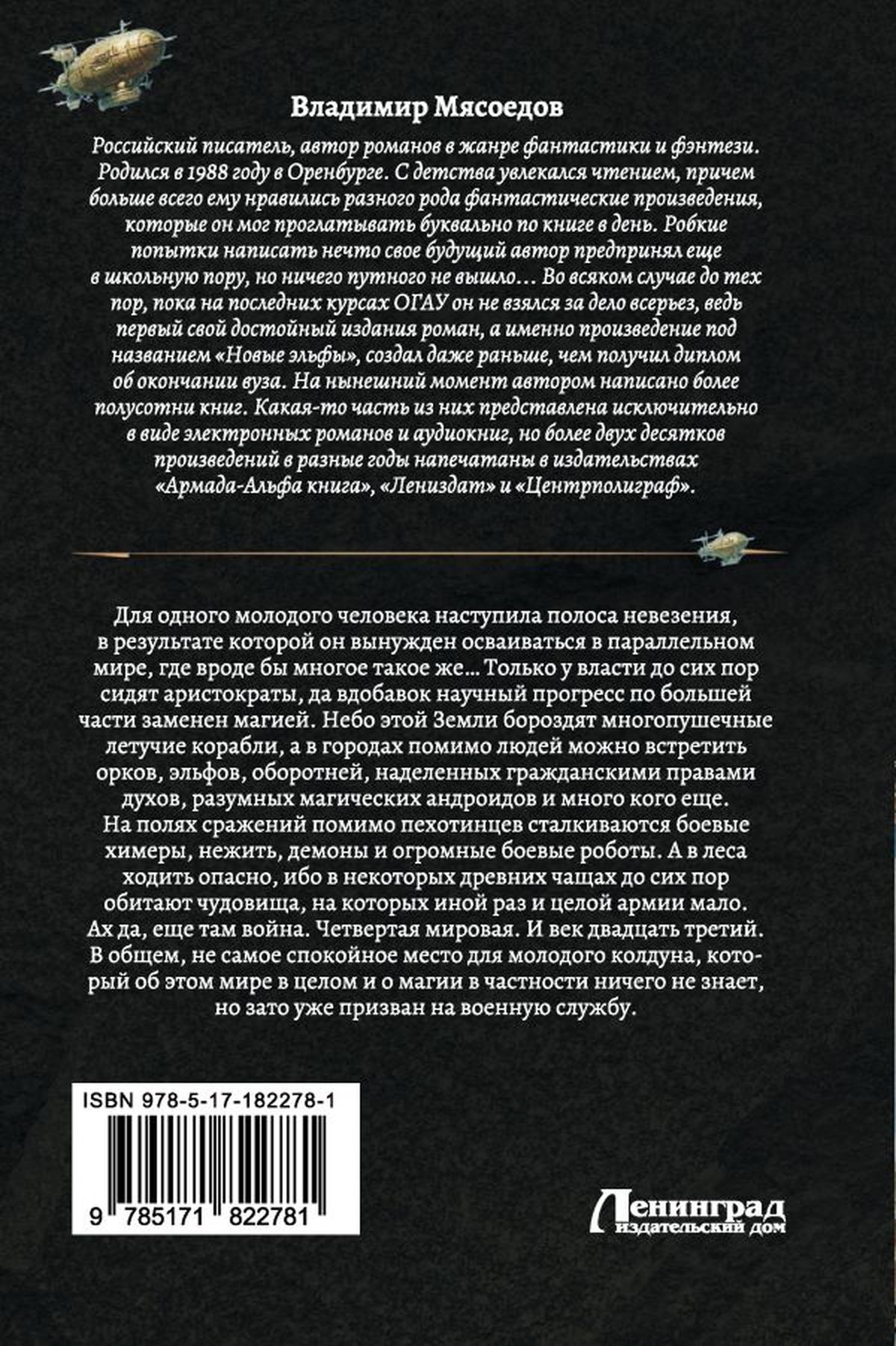 A young man has suffered a run of bad luck, forcing him to navigate a parallel world where much seems to be the same... Only aristocrats still hold power, and scientific progress has largely been replaced by magic. Multi-cannon flying ships ply the skies of this Earth, and in the cities, alongside humans, you can encounter orcs, elves, werewolves, spirits endowed with civil rights, sentient magical androids, and much more. On the battlefield, besides infantry, you encounter combat chimeras, undead, demons, and enormous combat robots. And the forests are dangerous, for some ancient thickets are still inhabited by monsters that sometimes require more than an entire army to defeat. Oh, and there's also the war. World War IV. And the twenty-third century. All in all, not the most peaceful place for a young sorcerer who knows nothing about this world in general or magic in particular, but has already been conscripted into military service.