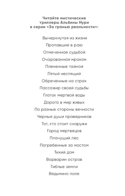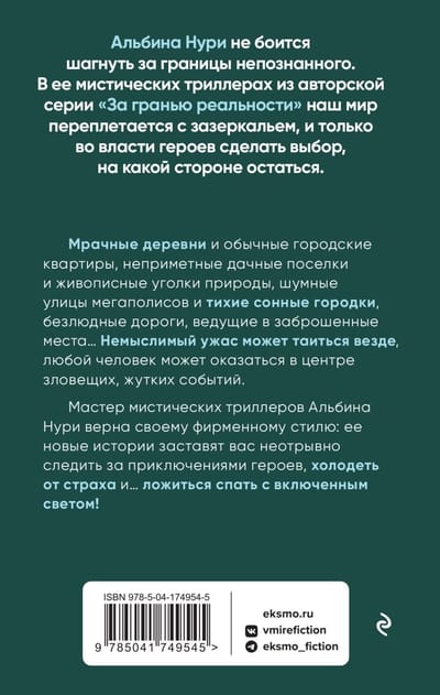 Gloomy villages and ordinary urban apartments, inconspicuous country villages and picturesque corners of nature, noisy streets of megacities and quiet sleepy towns, deserted roads leading to abandoned places... Unthinkable horror can lurk anywhere, anyone can find themselves in the center of sinister, eerie events. The master of mystical thrillers Albina Nuri is true to her trademark style: her new stories will make you follow the adventures of heroes, chill with fear and... go to bed with the lights on!