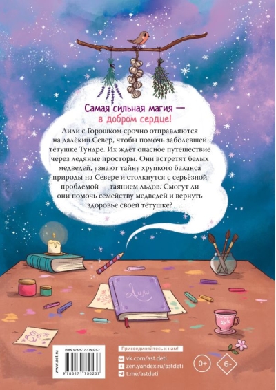 Lily and Pea urgently set off for the distant North to help their ailing Aunt Tundra. A dangerous journey through icy expanses awaits them. They will encounter polar bears, learn the secret of the fragile balance of nature in the North, and face a serious problem: melting ice. Will they be able to help the bear family and restore their aunt to health?