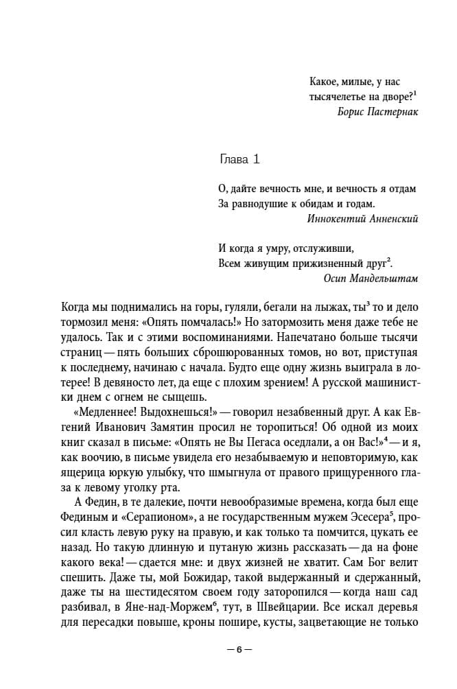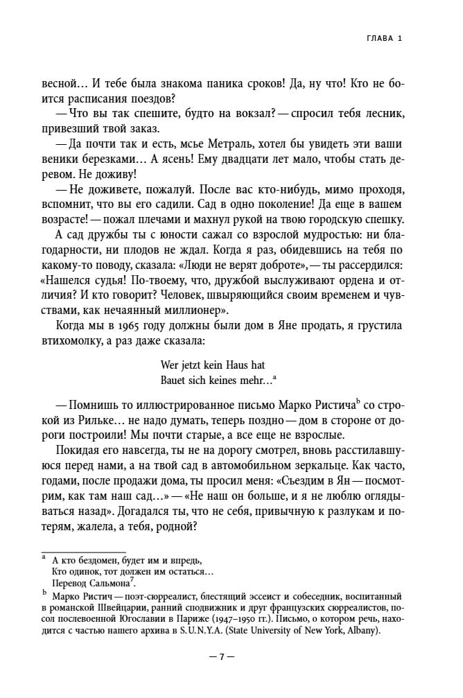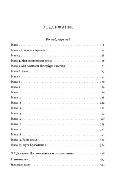 In memoirs that balance between memoir and fiction, novelist, poet, and translator Irina Efimovna Kunina (1900–2003) sums up her extraordinary life. In the 1910s, she studied at the Higher Women's Raevsky Courses, joined St. Petersburg literary circles, and associated with Alexander Blok, Nikolai Gumilev, and Osip Mandelstam. Then came a move to Kyiv, where she met local and visiting literary figures, a flight to Odessa, participation in the White Army's Bredovo campaign, marriage to a White Guard colonel, a Polish internment camp for White Army units, escape from it, Constantinople, and, finally, Zagreb, where she broke up with her husband. In 1924, she returned to Russia, where she wrote newspaper reviews, song lyrics, and screenplays, appeared in several films, and became friends with Mikhail Zoshchenko. However, after traveling abroad in 1926, Kunina did not return and married the Croatian lawyer Bozidar Aleksander, who later became a prominent Yugoslav diplomat. She lived with him for half a century. During this period, she associated with many diplomats and writers, including Yevgeny Zamyatin and Sergei Zweig. Kunina's memoirs are a rare testimony of someone who survived all the cataclysms of the 20th century (three Russian revolutions, the First World War, the Civil War, and the Second World War) and managed to adapt to a wide variety of cultural traditions.