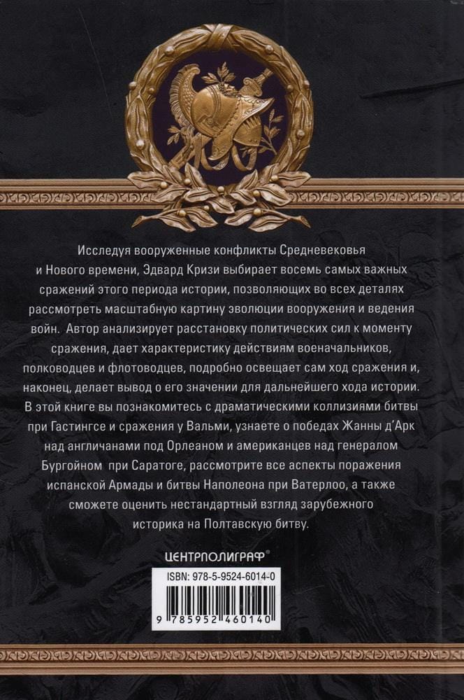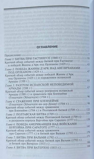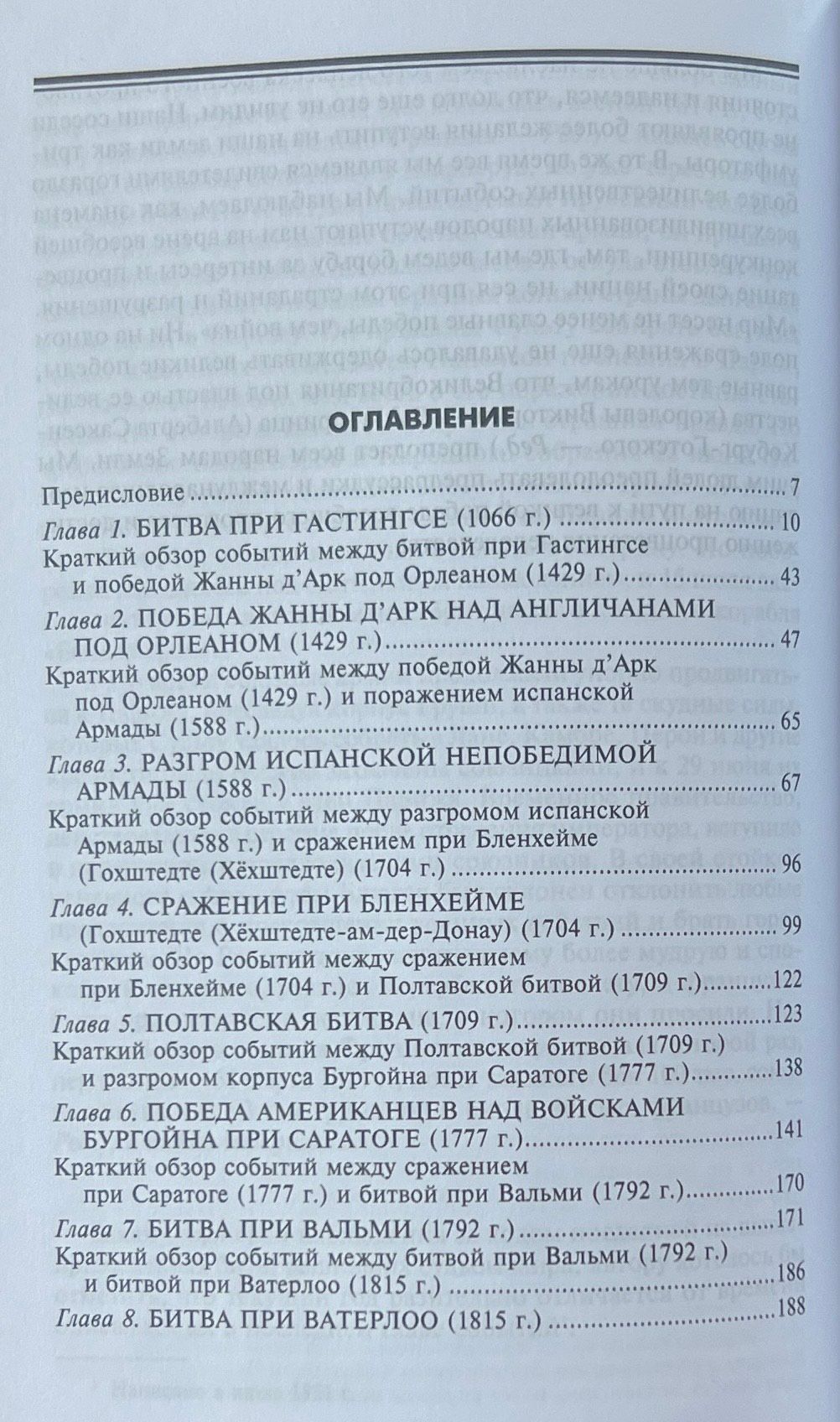 In this book you will get acquainted with the dramatic collisions of the Battle of Hastings and the Battle of Valmy, learn about the victories of Joan of Arc over the British at Orleans and the Americans over General Burgoyne at Saratoga, consider all aspects of the defeat of the Spanish Armada and Napoleon's battle at Waterloo, and also be able to evaluate the non-standard view of a foreign historian on the Battle of Poltava.