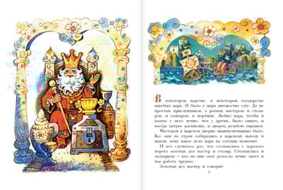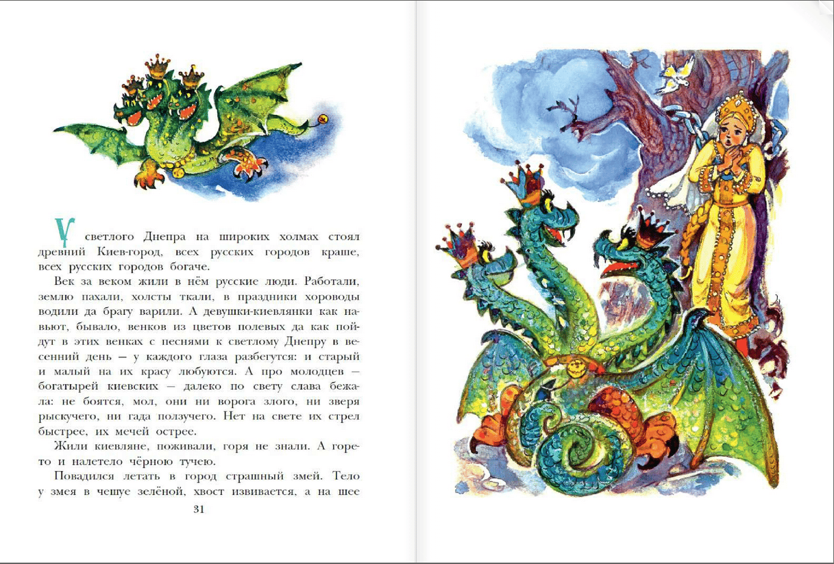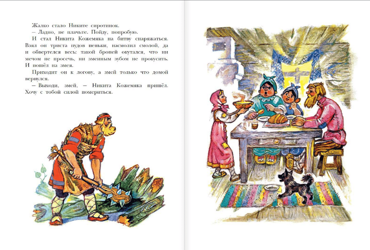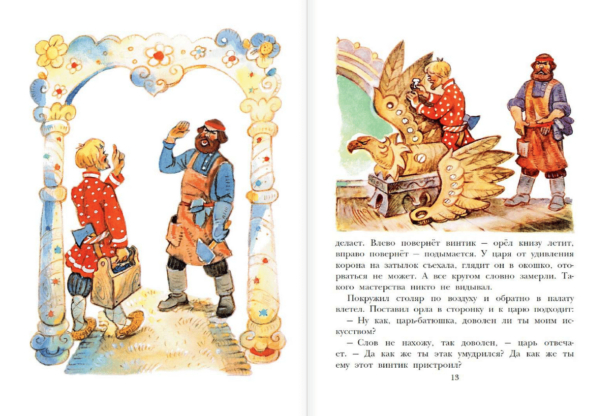 The book includes some of the most interesting Russian folk tales in classic retellings. The fairy tale characters of "The Wooden Eagle", "Nikita Kozhemyaka" and "Morozko" were drawn by the famous artist, Honored Worker of the RSFSR Leonid Vladimirsky. He believed that even evil characters in children's books should look kind and not frighten young readers. Therefore, fairy tales in drawings by L. Vladimirskiy can be read even to young children.