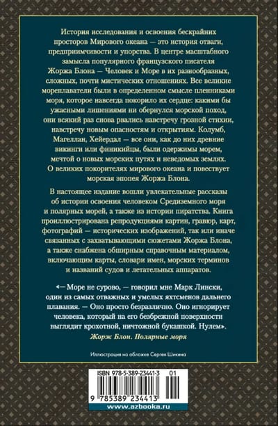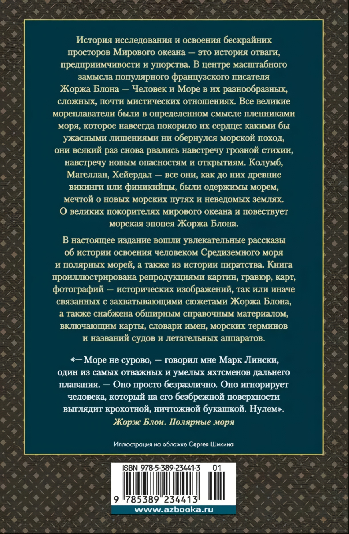 The story of the exploration and development of the vast expanses of the world's oceans is a story of courage, enterprise and perseverance. In the center of the large-scale plot of the popular French writer Georges Blon - Man and the Sea in their diverse, complex, almost mystical relationship. All great seafarers were in a sense prisoners of the sea, which forever conquered their hearts: no matter how terrible hardships would turn out to be a sea voyage, they every time again rushed towards the formidable element, towards new dangers and discoveries. Columbus, Magellan, Heyerdahl - all of them, like the ancient Vikings or Phoenicians before them, were obsessed with the sea, the dream of new sea routes and unknown lands. On the great conquerors of the world's oceans and tells the sea epic Georges Blon. This edition includes fascinating stories about the history of human exploration of the Mediterranean Sea and polar seas, as well as from the history of piracy. The book is illustrated with reproductions of paintings, engravings, maps, photographs - historical images, in one way or another related to the exciting stories of Georges Blon, and is also provided with extensive reference material, including maps, dictionaries of names, nautical terms and names of ships and aircraft.