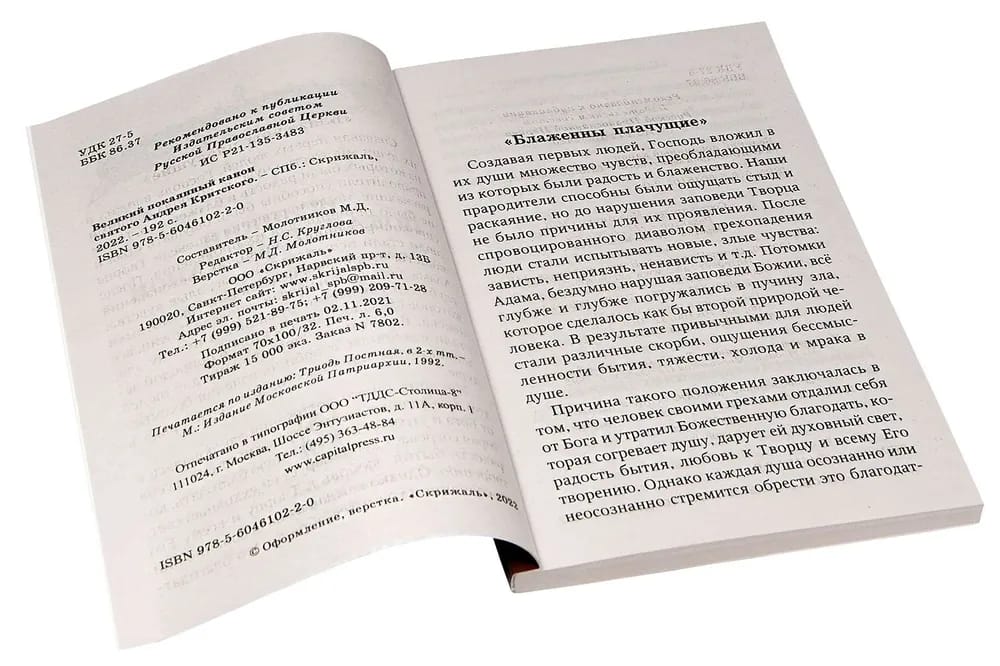 The book includes the liturgical texts necessary for an Orthodox Christian during Great Lent: the Great Penitential Canon of St. Andrew of Crete, read on the first four days of Lent; then the entire text of the Canon as it is read on Thursday of the fifth week of Great Lent, at the service called "Standing of Mary of Egypt"
