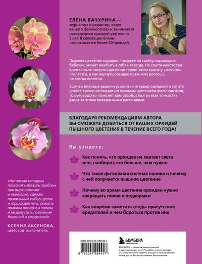 The author of the book, Elena Bachurina, is a journalist and editor, runs her own blog about plants and has been breeding orchids for about five years. Her personal collection includes more than 50 phalaenopsis, and she is very happy to share her secrets and experience with you. The author's technique will help you understand how to make orchids bloom longer, more often and more luxuriantly.