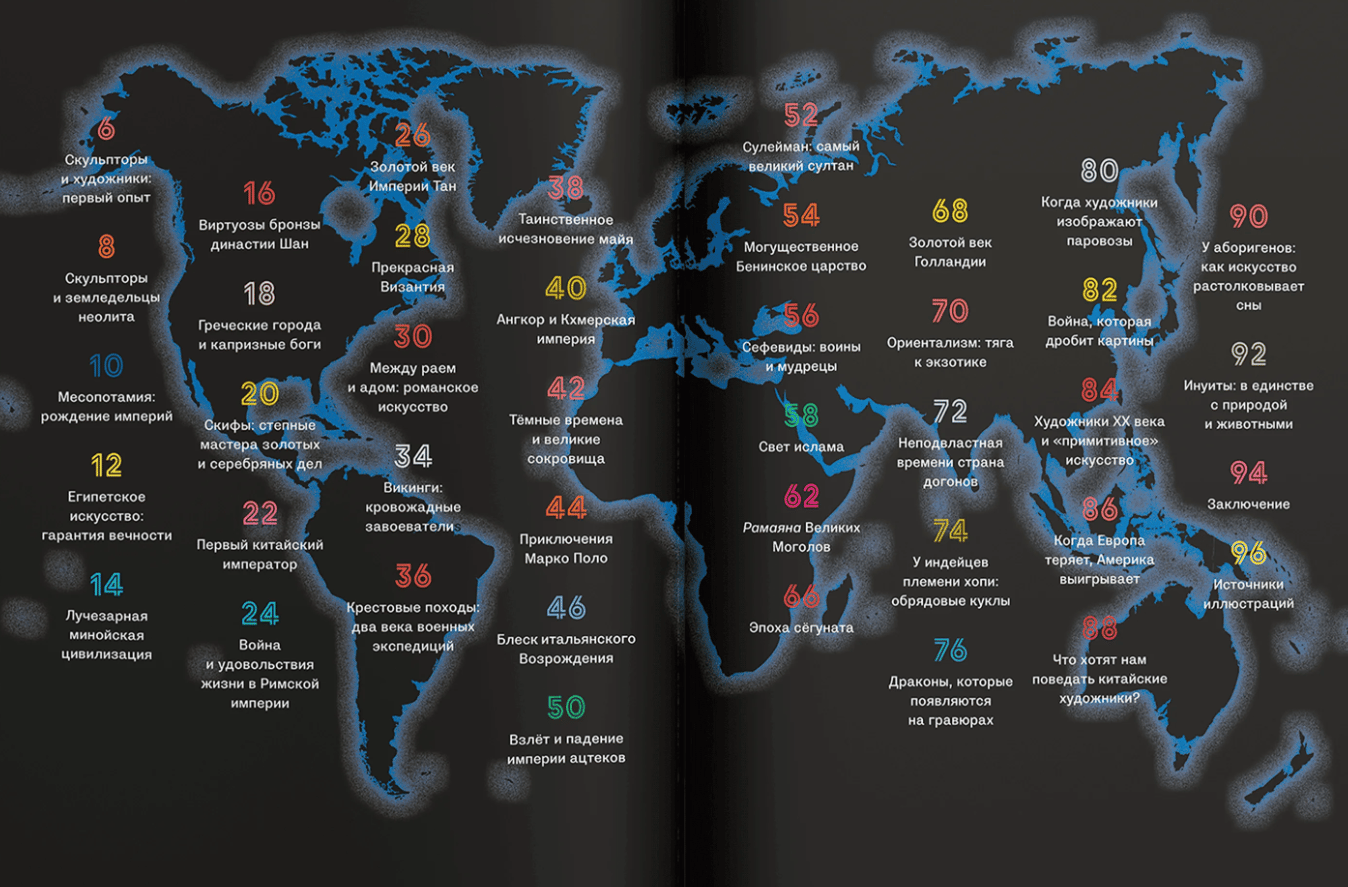 What animals were painted on rocks by prehistoric people in Europe and Africa? How were the palaces of Mesopotamia and the tombs of Egyptian pharaohs decorated? Why did the inhabitants of Crete depict bulls and fish on frescoes? How did the Tang Empire and the first Chinese bronze products appear? Why did the Mayan civilization disappear? Why is Suleiman considered the greatest sultan? How did Benin become a powerful state of merchants and sculptors? What is the charm of Persian miniatures? How were the marvelous adventures of the Indian prince Rama illustrated? When did the Impressionists discover the charm of Japanese prints? Why were Gauguin and Picasso inspired by the works of sculptors from Africa and Oceania? The answers to these and other questions are under the cover.
