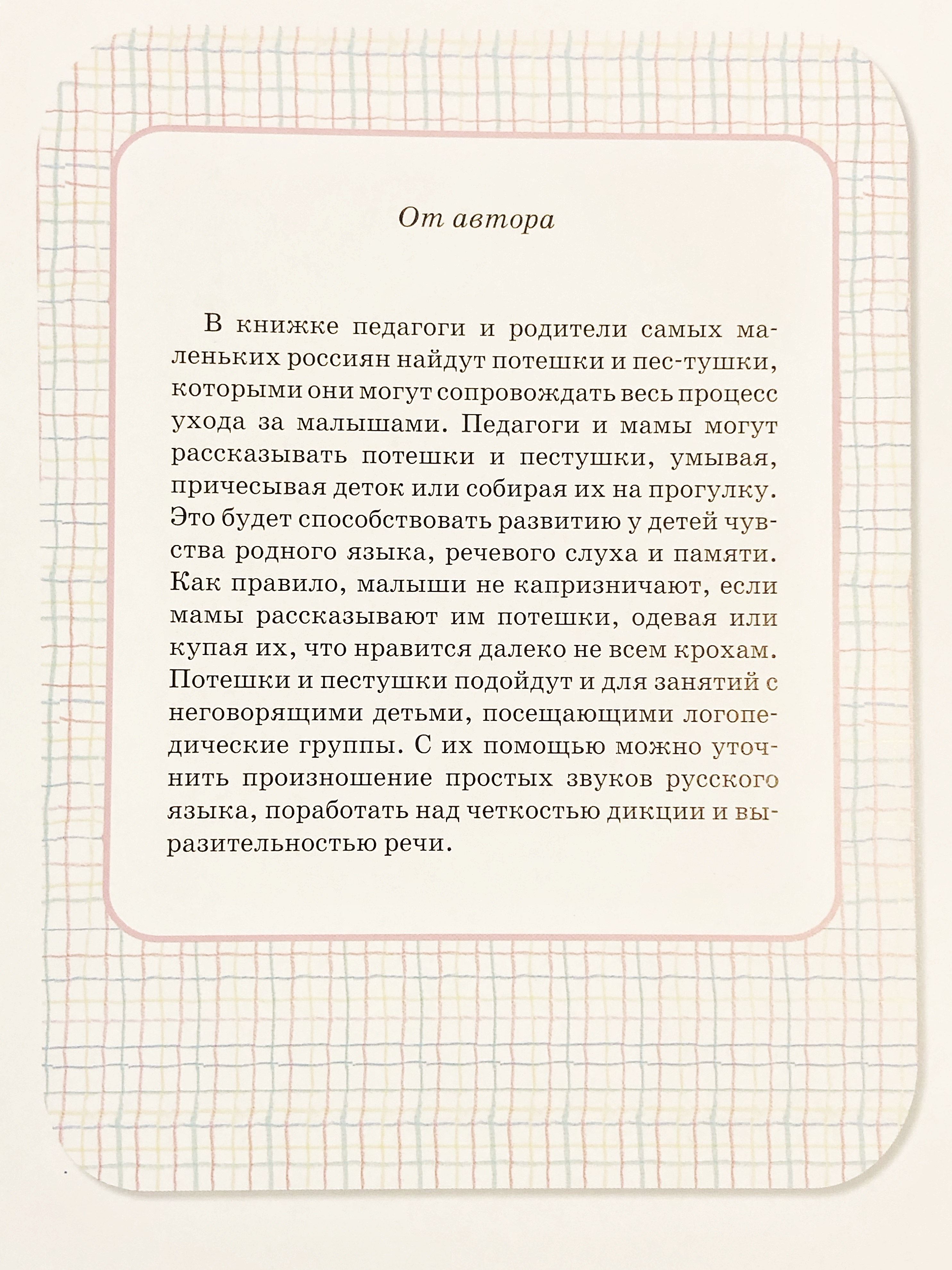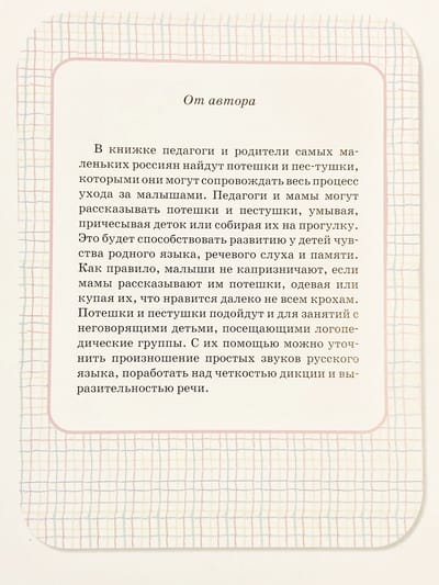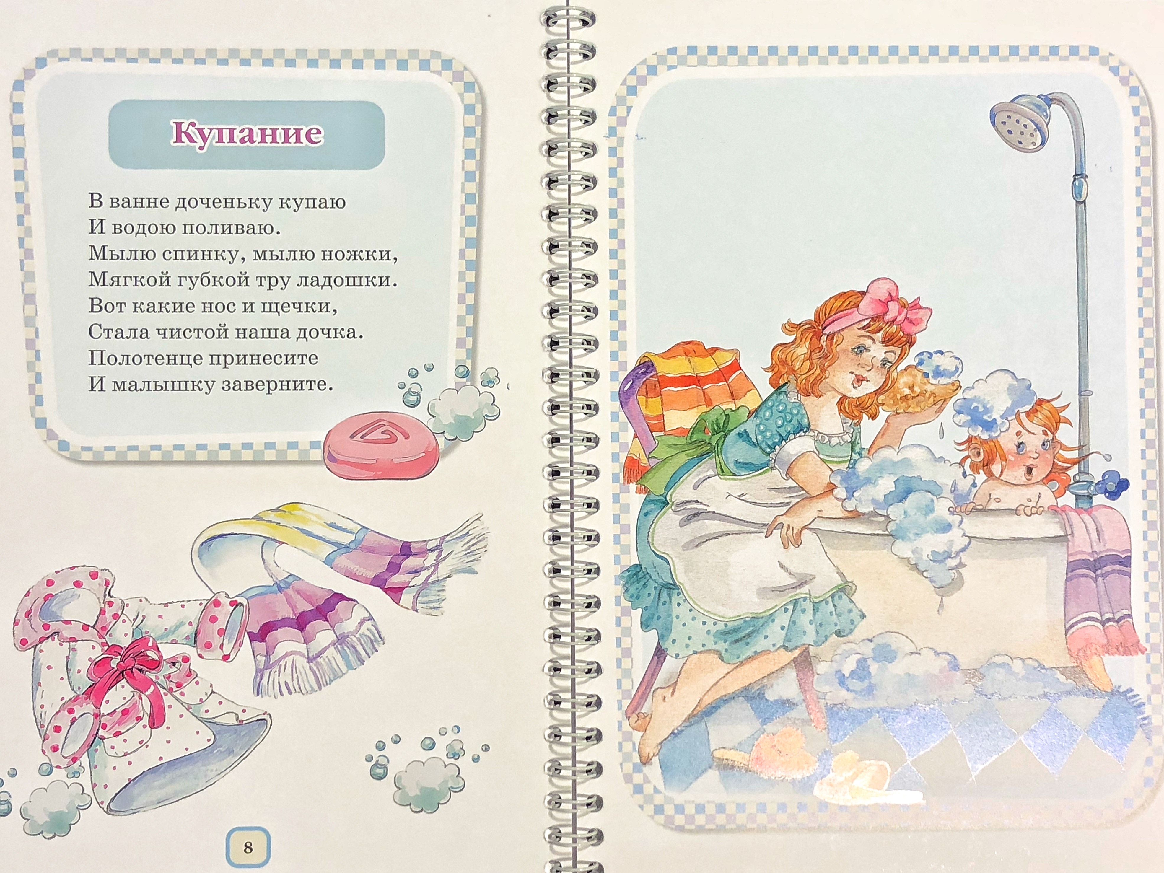 Cheerful little ones will help you to vocalize the whole process of caring for babies. Adults can tell them during the process of feeding and washing the baby, while getting ready for a walk and during the walk itself. Little rhymes will help to develop a sense of the native language in babies. They are suitable for classes to clarify the pronunciation of simple sounds (sounds of early ontogenesis). Babies will not only enjoy looking at the pictures and telling what is drawn on them, but will also want to tell the rhymes first together with an adult, and then independently.