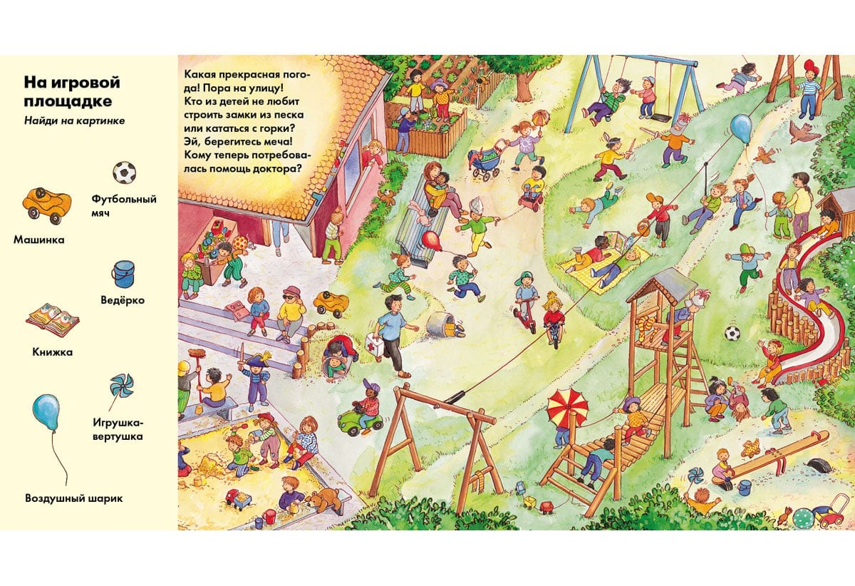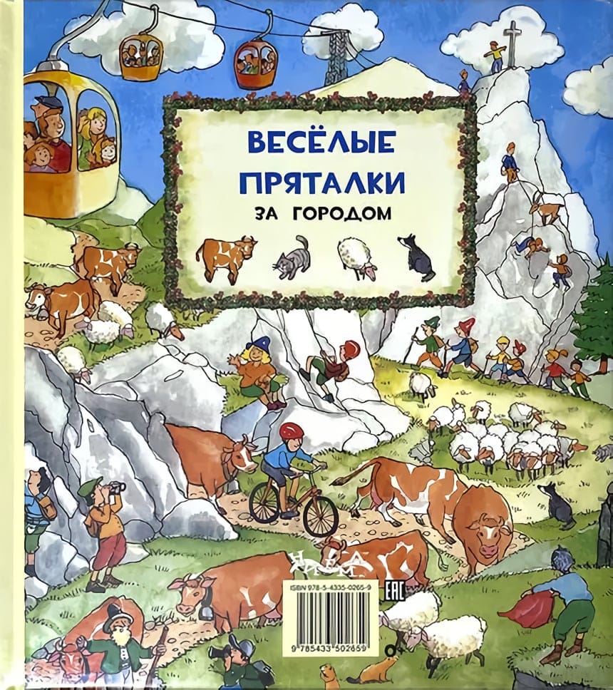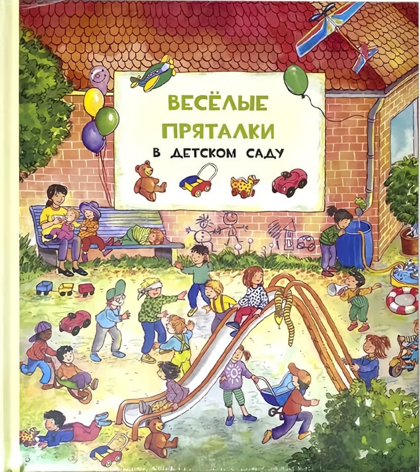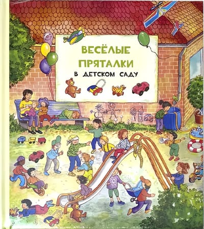 Do you play hide-and-seek in kindergarten? Of course, there are lots of things to do in kindergarten. There is a playroom, a gym and a playground with slides! But today, together with the children in the kindergarten came a little mouse. He is very cunning, he is not easy to catch! Look carefully at the pictures. Did you find the mouse? And one more task: name all the toys that children play with in this kindergarten. And how many interesting things you can meet in the countryside! You can climb the tower of an old fortress, have a picnic, swim in the river or climb high into the mountains. Deer, beavers, cows and horses can be found here. Dogs and cats are also more at ease in the countryside. Look carefully at the pictures. Is there a dog or a puppy on all of them? And now again a task: name all the animals that are drawn in this book. For adults to read to children.