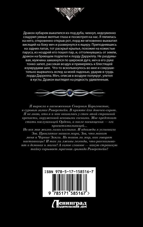 I grew up in the snowy Northern Kingdom, in the harsh castle of Riverstane. In an orphanage for girls. I don’t know who I am and how I ended up at the walls of this terrible fortress, surrounded by centuries-old pines. I am destined to become a novice of the Order, and after initiation — its enlightener... But my whole life is just an illusion. And one day I heard the Call. The curse of our world, the Call that beckons me to the Black Lands. But is the world as the mentors say? And are the legends that tell about demons and magicians so false? And most importantly — what terrible secret does the gloomy bulk of Riverstane hide?