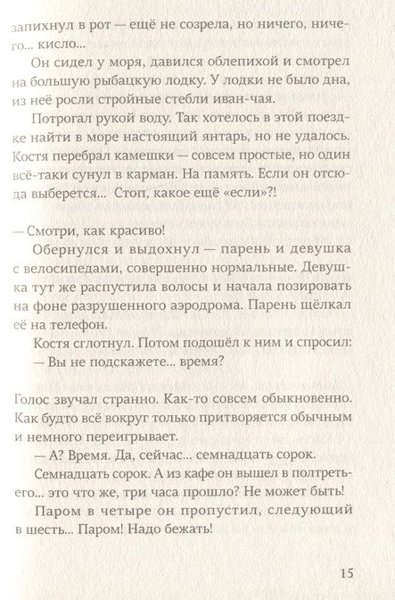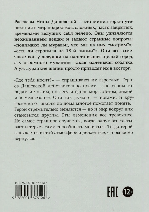 "Where have you been?" the adults ask them. Dashevskaya's heroes are indeed carried - through their own cities and foreign ones, through the forest and along the sea. In summer, winter and off-season. They think this way - with their feet, and the circumnavigation from school to home helps them understand a lot. They wonder at unexpected things and ask strange questions: "do ants realize we're looking at them?"; "are there rafters on line 18?". They are open, they notice everything: over there, a girl has a whole city embroidered on her coat, and a huge man has such a small dog. And silly hats just delight them. It's often difficult for them. Learning, getting along with parents, fitting into other people's rules, conforming. And sometimes it's hard to breathe. And the only hope is that one day they can run a windmill that will clean the air and everyone can finally breathe freely.