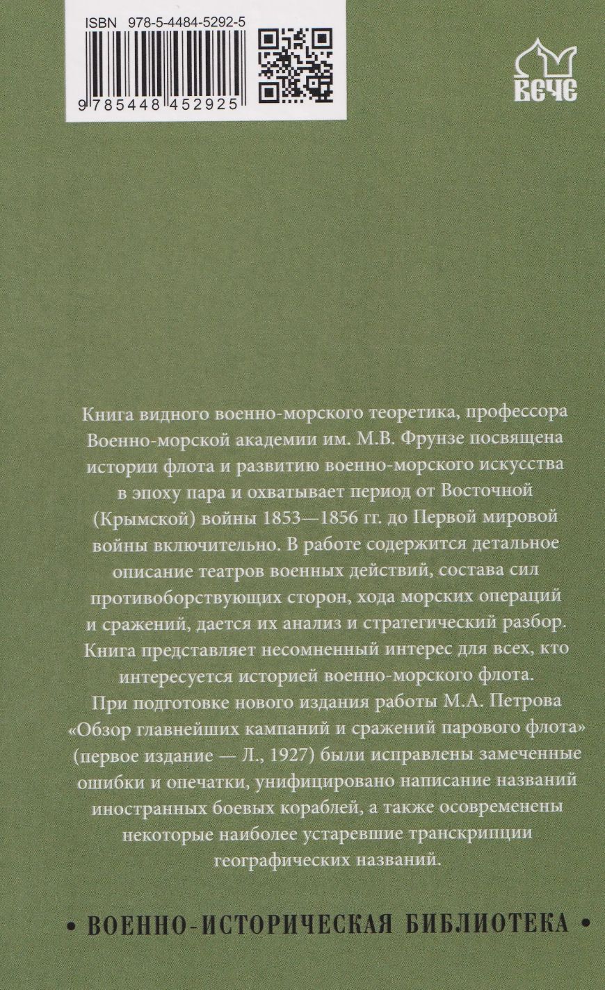 This book by the prominent naval theorist and professor at the M.V. Frunze Naval Academy is dedicated to the history of the navy and the development of naval art in the age of steam, covering the period from the Eastern (Crimean) War of 1853–1856 to and including the First World War. The work contains a detailed description of the theaters of military operations, the composition of the opposing forces, the course of naval operations and battles, and provides an analysis and strategic review. This book is undoubtedly of interest to anyone interested in the history of the navy. In preparing this new edition of M.A. Petrov's "Overview of the Major Campaigns and Battles of the Steam Fleet" (first published in Leningrad, 1927), errors and typos have been corrected, the spelling of foreign warship names has been standardized, and some of the more outdated transcriptions of geographical names have been updated.