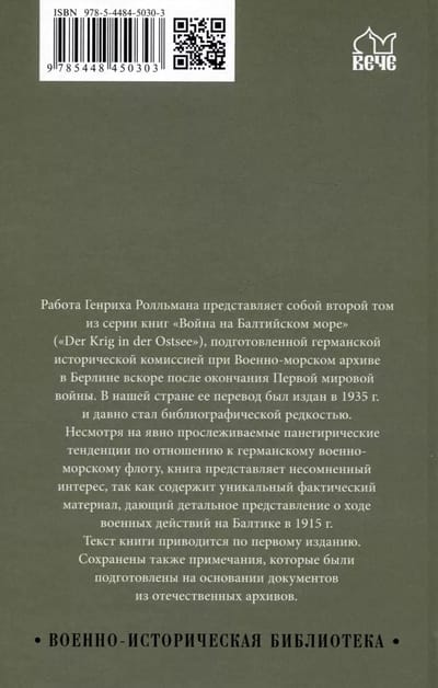 Heinrich Rollmann's work is the second volume in a series of books entitled Der Krig in der Ostsee (The War on the Baltic Sea), prepared by the German Historical Commission at the Naval Archive in Berlin shortly after the end of the First World War. In our country, its translation was published in 1935 and has long become a bibliographic rarity.Despite the clearly traceable panegyric tendencies towards the German Navy, the book is of undoubted interest, as it contains unique factual material that gives a detailed picture of the course of hostilities in the Baltic in 1915.The text of the book is given according to the first edition. The notes, which were prepared on the basis of documents from domestic archives, have also been preserved.