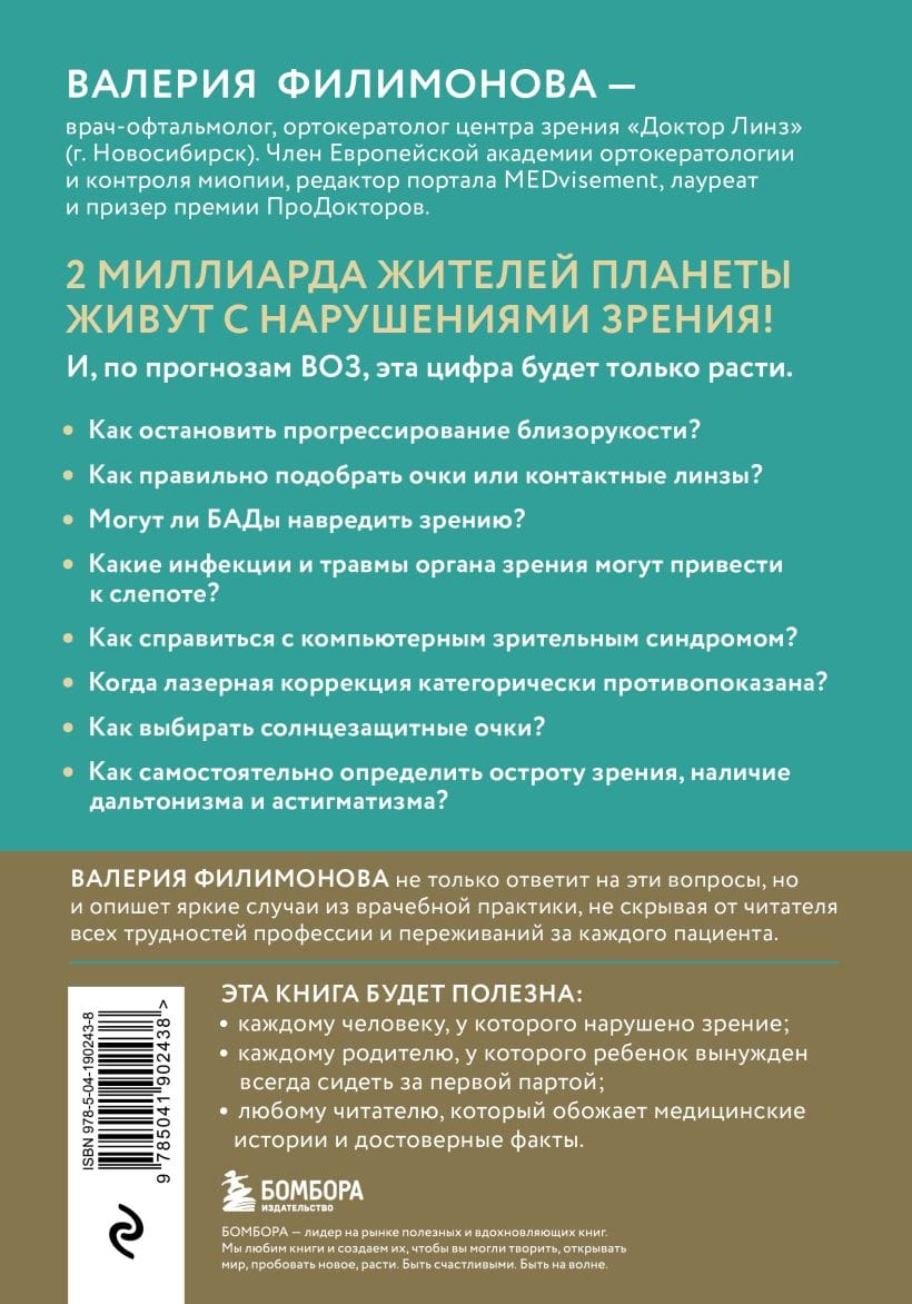 Did you know that this doctor performs eye surgery - stitches the eyelid, operates cataracts, removes the eyeball and does laser vision correction? In this book, ophthalmologist Valeria Filimonova will describe the most striking cases of medical practice, give recommendations on preserving vision, selection of glasses and contact lenses, debunk the most popular myths about eye diseases and tell the story of his professional success.