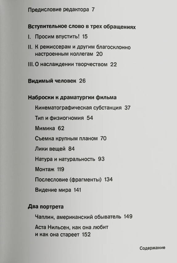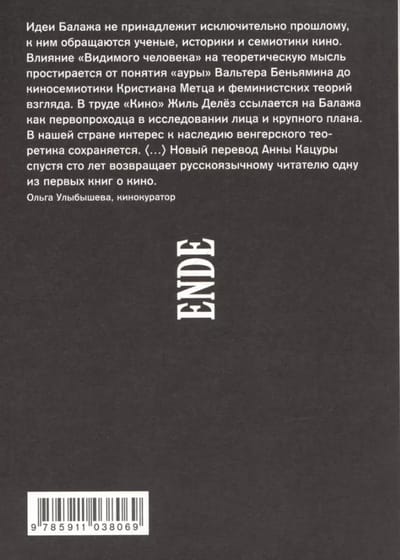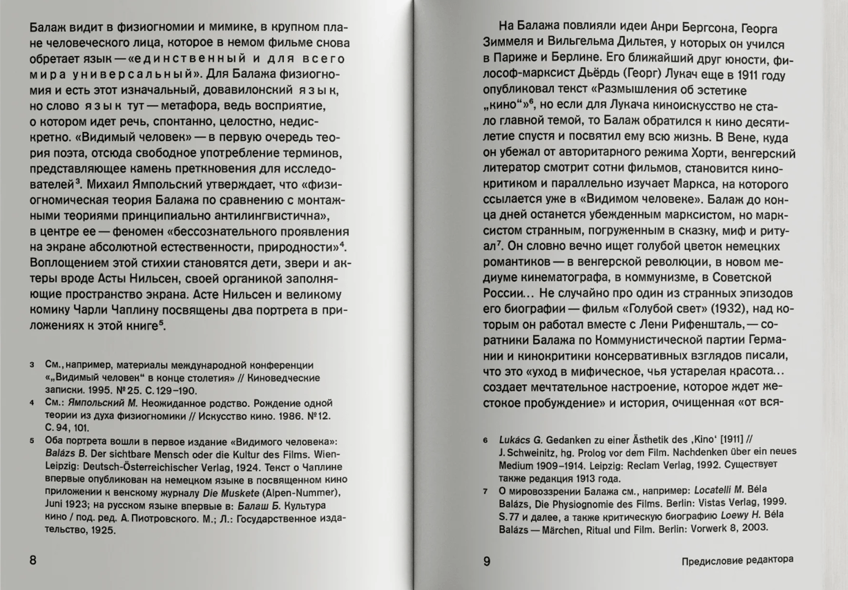 The Visible Man (1924) by the Hungarian writer and poet Bela Balaz (1884–1949) was one of the first books on film theory. Believing that “cinema makes man and his world visible,” Balage – influenced by the ideas of Henri Bergson, Georg Simmel and Wilhelm Diltheus, from whom he studied in Paris and Berlin – turns to physiognomy and facial expressions, becoming a pioneer in the study of face and close-up. He enters into polemics with Kuleshov and Eisenstein to reveal the aesthetic laws of cinema, describes and analyzes its forms of expressiveness, reveals the principles that made cinema so popular. Balage examines different types of films, reveals the secrets of optical tricks, evaluates a new direction – color cinema – reveals the meaning of sound and music for films, ironically over the “happi end”. Balazha’s ideas do not belong exclusively to the past, they are constantly addressed by scientists, historians and semiotics of cinema. The influence of "The Visible Man" on theoretical thought stretches from Walter Benjamin's notion of "aura" to Christian Metz's film-semiotics and feminist theories of the view.
