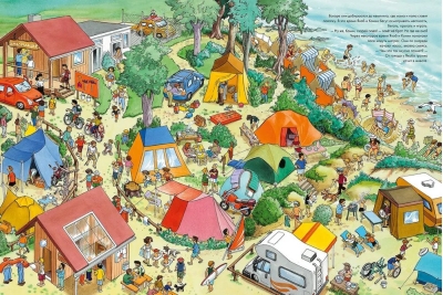 Colorful large-format wimmelbook with detailed illustrations. Together with their favorite characters the child will make a fascinating journey: visit a campsite by the sea, watch a performance in a pirate town, see lions and penguins in the zoo and help Jacob find Connie, who always disappears somewhere! Wimmelbuch - a great training of logic, attention and diligence, as well as the development of imagination and speech. Bright large illustrations with a lot of details will fascinate the child and awaken his curiosity. The book is made of dense cardboard, the pages have rounded corners for the convenience and safety of the little reader.