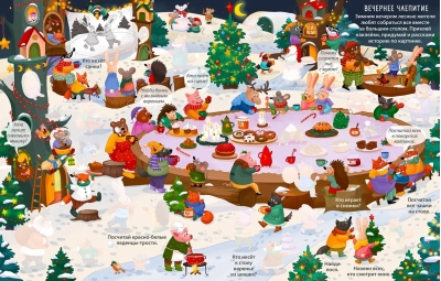 - 13 backgrounds where your child will learn how forest dwellers celebrate the New Year: how they prepare for winter and rejoice at the first snow; how they slide and skate; how they play in an ice fort; how they build snowmen and decorate a Christmas tree; how they celebrate the New Year and put on a performance.