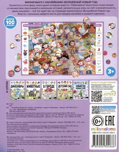 Take a journey back in time with Malamalama! Colorful illustrations featuring a variety of prehistoric animals from different eras, interesting facts, counting and attention games, and bright stickers—all await you on the pages of the "Magical New Year" Wimmelbook. Together with your child, find a place for each sticker and bring the pictures to life.