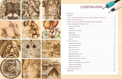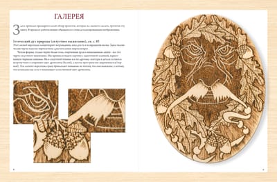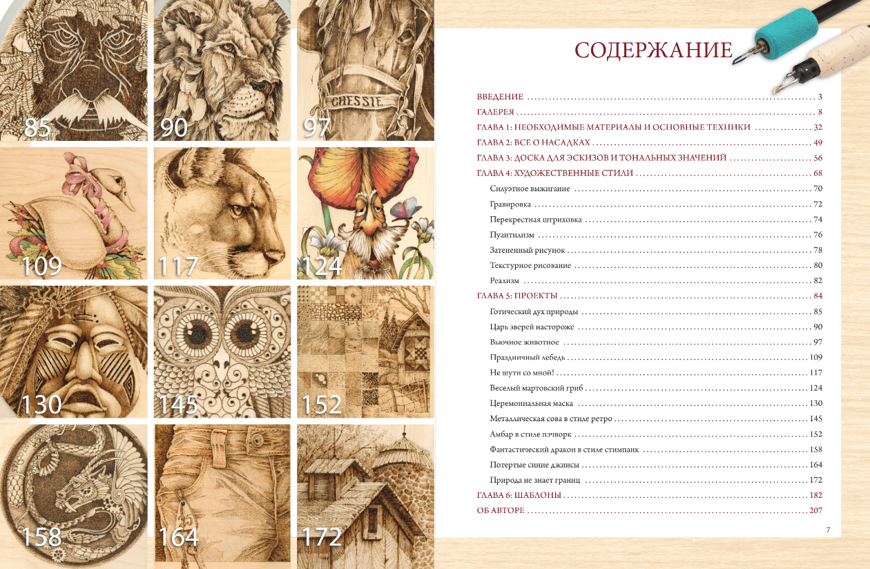 - detailed lessons on seven wood burning techniques from engraving to realism;