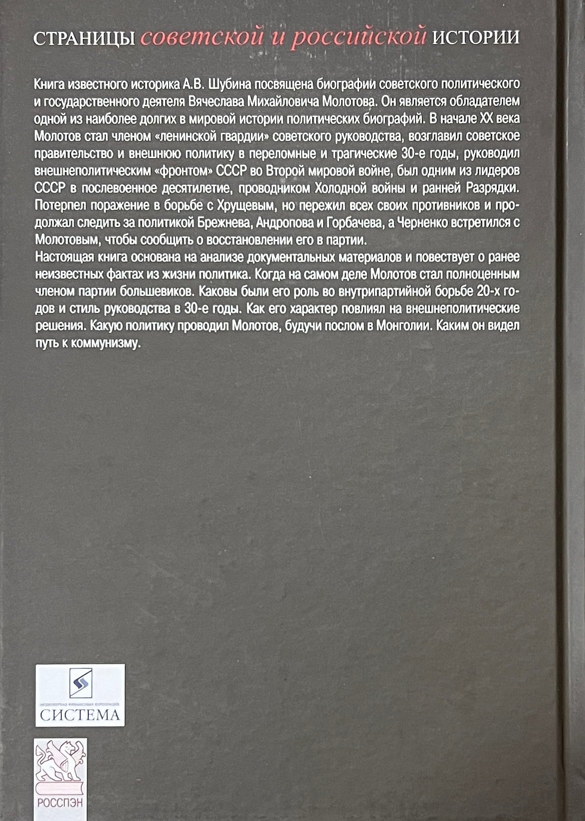 The book by the famous historian A.V. Shubin is devoted to the biography of the Soviet political and statesman Vyacheslav Mikhailovich Molotov. He is the owner of one of the longest political biographies in world history. In the early twentieth century, Molotov became a member of the "Leninist Guard" of the Soviet leadership, led the Soviet government and foreign policy in the crucial and tragic 1930s, directed the USSR's foreign policy "front" in World War II, was one of the USSR's leaders in the postwar decade, a promoter of the Cold War and early détente. He was defeated by Khrushchev but outlived all his opponents and continued to follow the policies of Brezhnev, Andropov, and Gorbachev, and Chernenko met with Molotov to signal his reinstatement to the party. The present book is based on the analysis of documentary materials and tells about previously unknown facts from the life of the politician. When in fact Molotov became a full-fledged member of the Bolshevik Party. What was his role in the intra-party struggle of the 20s and leadership style in the 30s. How his character influenced foreign policy decisions. What policy Molotov pursued as ambassador to Mongolia. How he saw the path to communism.