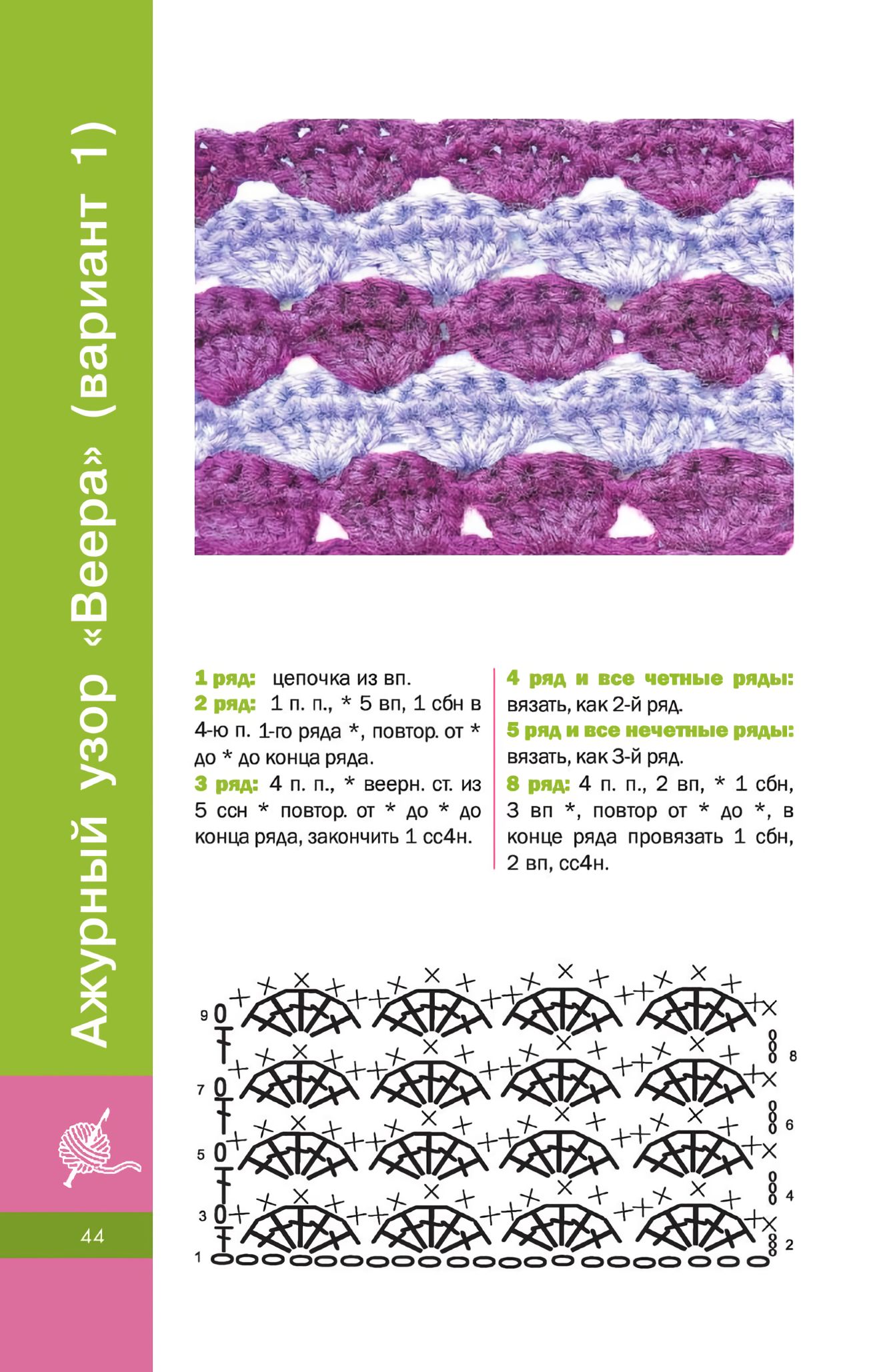 Step by step, you will learn to read the patterns and knit basic elements: air loops, double and single crochets, bunches, fan stitches. And then knit beautiful motifs: straight fabrics, squares, circles, triangles, from which you can create clothing items and home decorations.