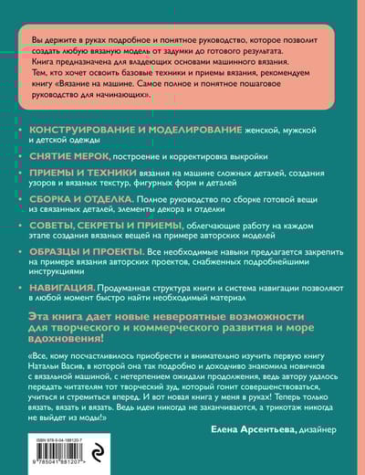 An expanded edition of the famous machine knitting book in the famous series! The second book of the popular author continues to teach everyone the skills of machine knitting: modeling, patterns and types of knitted fabric, knitting individual parts and much, much more. And all this with detailed step-by-step photos, clear instructions, numerous tips and findings of the author. Open the book, and you will find: - Design and modeling of women's, men's and children's clothing. Measurement, construction and adjustment of the pattern. - Techniques and techniques for machine knitting complex details, creating patterns and knitted textures, shaped shapes and details. - Assembly and finishing. A complete guide to assembling the finished garment from bound pieces, decorating and finishing elements. - Tips, secrets and techniques that facilitate the work at each stage of creating knitted things on the example of author's models. - Samples and projects. All necessary skills are offered to consolidate on the example of knitting author's projects, provided with detailed instructions. - Navigation. Thoughtful structure of the book and navigation system allows you to quickly find the necessary material at any time.