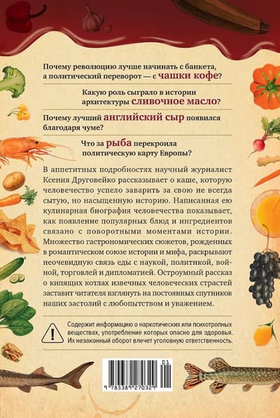 Science journalist Ksenia Drugoveyko gives a fascinating account of how the emergence of the most popular dishes, products and ingredients is connected to turning points in human history. The author, in a lively manner and with a great sense of humour, offers the reader a look at the biography of humanity through the history of food. The unobvious connection between cooking and science, politics, war, trade and diplomacy makes us look at familiar recipes and constant companions of our feasts with curiosity and respect.
