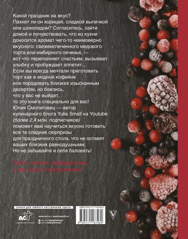 If you have always dreamed of making a cake like in a fashionable coffee shop or to please your loved ones with an exquisite dessert, but were afraid that you will not succeed, then this book is especially for you! Yulia Smoligovets - the author of culinary blog Yulia Small on Youtube (more than 1.3 million subscribers) will help you learn how to deliciously prepare all those sweet surprises for the holiday table that will not leave your loved ones indifferent. But don't forget to pamper yourself too! Let every day be a holiday for you!