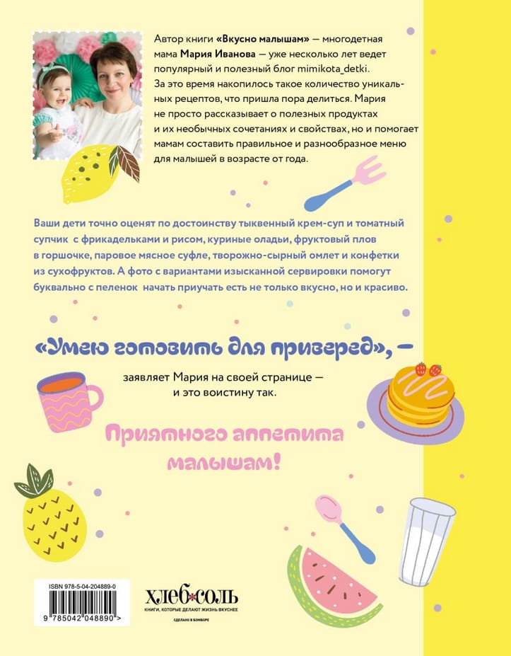 The book "Tasty for Kids" by Maria Ivanova, a mother of many children, is addressed to modern caring and conscious parents who value their child's health and their time. The author's recipes are already loved by almost 60 thousand subscribers of her pages in social networks. A rich culinary path, thorough knowledge of child psychology and physiology, gorgeous photos, beauty of serving, thoughtfulness in everything invariably bring success to dishes based on Maria's recipes. And not only with babies, although the book is primarily for parents of children from a year and older.