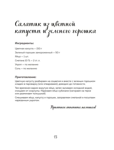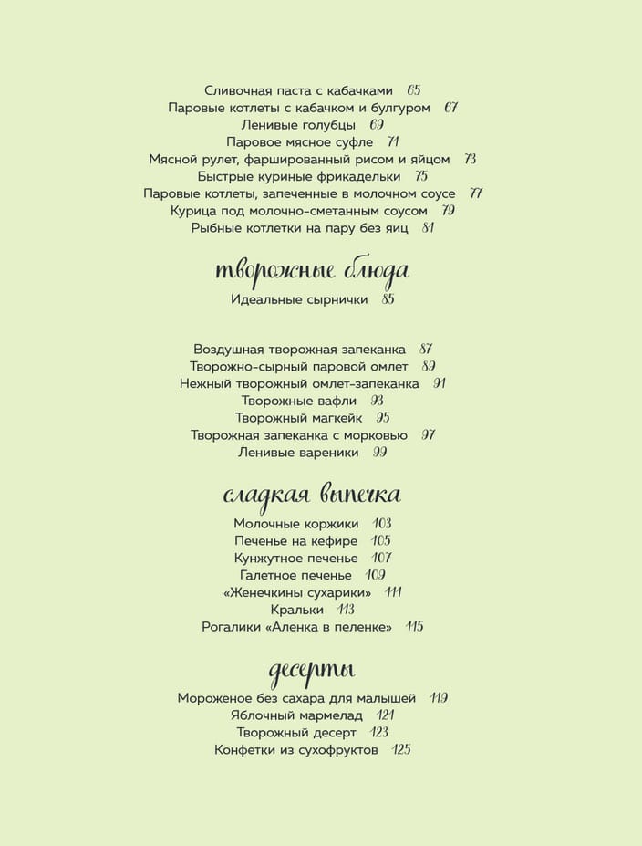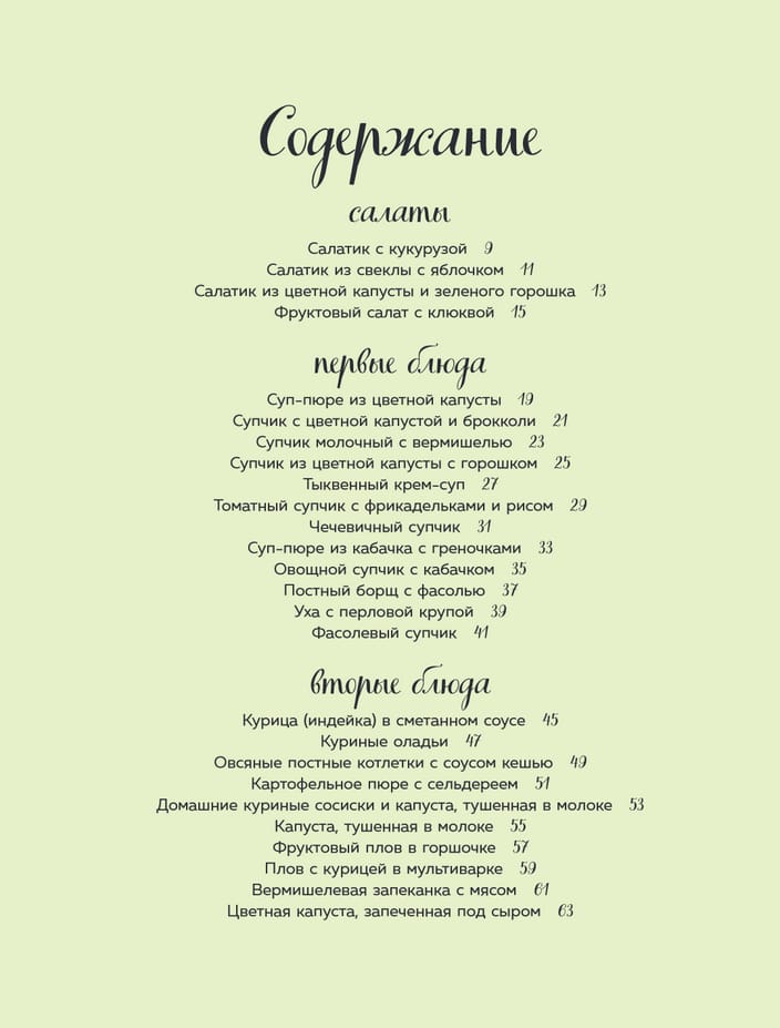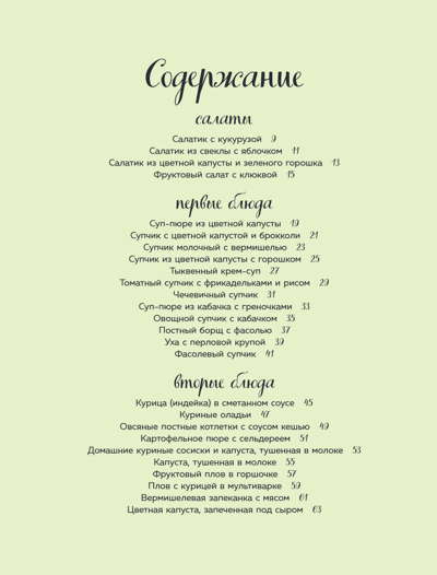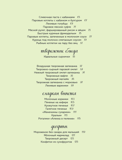 There are many familiar from kindergarten age classics: borscht, milk soup, many types of cutlets, vegetable salads, omelets, cheesecakes, cookies, marmalade and even ice cream. But each recipe has nuances that turn it into a topical exclusive: pumpkin can be used to make a trendy cream soup, cottage cheese can be added to an omelet, minced meat becomes a soufflé, and ice cream is made without sugar. And all the recipes are simple and budget-friendly. They will help you save a lot of parental time and money for the most valuable thing - communication with children. Recipes from different sections (salads, first, second, curd dishes, baked goods, desserts) can be combined endlessly, to the delight of kids, making new and new variants of useful and beautiful breakfast, lunch, afternoon snack or dinner. And the author's warm, human and slightly old-school style will definitely appeal to experienced parents.