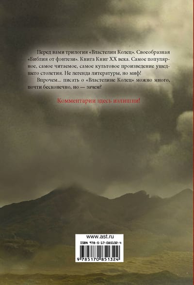 Before you is the trilogy "Lord of the Rings". A kind of "Fantasy Bible". The Book of Books of the twentieth century. The most popular, the most read, the most iconic work of the past century. Not a legend of literature, but a myth! However...one can write about "The Lord of the Rings" a lot, almost endlessly, but why? Comments here are superfluous!