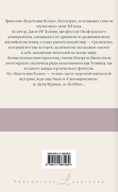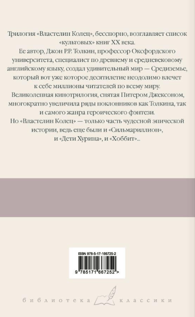 This edition includes the trilogy by John R. R. Tolkien "The Lord of the Rings" translated by V. Carrick and M. Kamenkovich. The translation is accompanied by comments that allow readers to dive deeper into the fairy-tale world, and learn more about the annals of the kings and rulers of Middle-earth, the Numenorean calendars, languages and peoples, and much more.