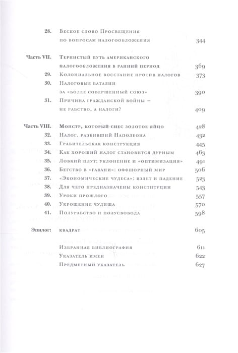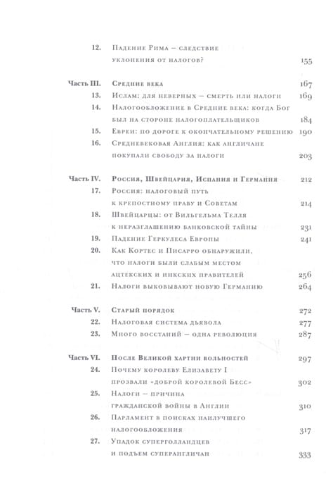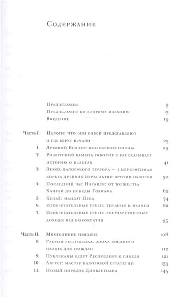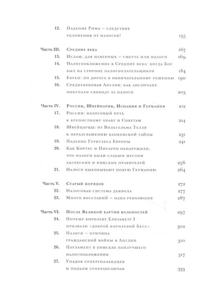 The author has devoted more than 20 years to writing this book, exploring how taxes have influenced the course of history. The book examines key episodes of tax policy in different eras and countries. From ancient Egypt to the present day, the author dissects the methods and justifications used by rulers and governments to rip off their subjects. Taxes are linked to the emergence and disappearance of states and empires; taxation gave rise to the prototypes of today's parliaments. The author deplores the level of modern discussions of taxation, from which the themes, arguments and knowledge developed by the great Enlightenment thinkers, who discussed taxation in connection with despotism and prosperity, and were interested in the good of the whole country rather than in "budgetary efficiency" and the interests of individual industries and groups of people, have completely disappeared.