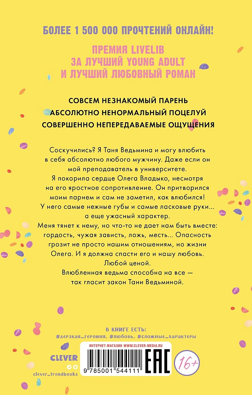 I won Oleg Vladyko's heart despite his fierce resistance. He pretended to be my boyfriend and didn't notice how he fell in love! He has the most tender lips and the most affectionate hands...and a terrible temper. I am attracted to him, but something prevents us from being together: pride, other people's envy, lies, revenge...Danger threatens not just our relationship, but Oleg's life. And I must save him and our love. At any cost. A witch in love can do anything - that's the law of Tanya the Witch.