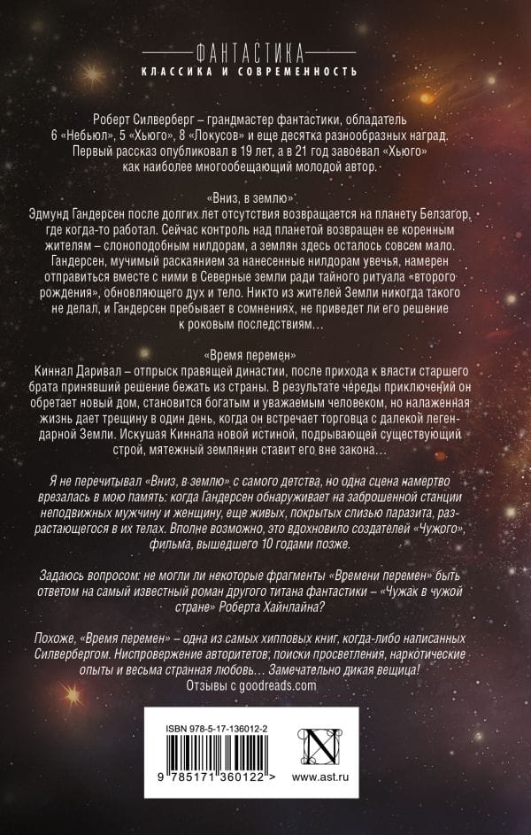 "Down to Earth." Edmund Gundersen, after many years of absence, returns to the planet Belzagor, where he once worked. Now control of the planet has been returned to its original inhabitants, the elephant-like Nildorians, and there are very few Earthlings left. Gundersen, tormented by remorse for his injuries to the Nildor, intends to travel with them to the Northern Lands for a secret "second birth" ritual that renews the spirit and body. No one on Earth has ever done such a thing, and Gundersen is in doubt as to whether his decision will have fatal consequences... "A Time of Change". Kinnal Dariwal is a scion of the ruling dynasty, who decided to flee the country after his older brother came to power. As a result of a series of adventures, he finds a new home, becomes a rich and respected man, but the established life gives a crack one day when he meets a merchant from a distant legendary Earth. Tempting Kinnal with a new truth that undermines the existing system, the rebellious Earthman outlaws him...