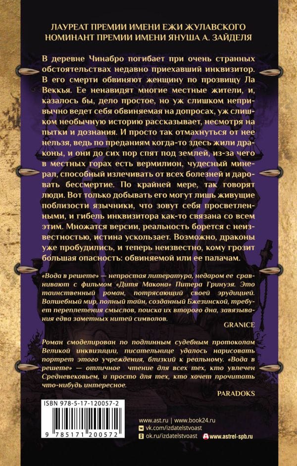 In the village of Cinabro, a recently arrived inquisitor dies under very strange circumstances. A woman nicknamed La Vecchia is accused of his death. Many locals hate her, and it would seem that the case is simple, but the accused behaves too unusually during interrogations, and tells too unusual a story, despite torture and inquiries. And you can’t just brush it off, because according to legend, dragons once lived here, and they still sleep underground, which is why the local mountains contain vermilion, a wonderful mineral that can cure all diseases and grant immortality. At least, that’s what people say. But only pagans living nearby, who call themselves enlightened, can mine it, and the death of the inquisitor is somehow connected to all this. Versions multiply, reality struggles with the unknown, the truth eludes. Perhaps the dragons have already awakened, and now it is unknown who is in greater danger: the accused or her executioners.