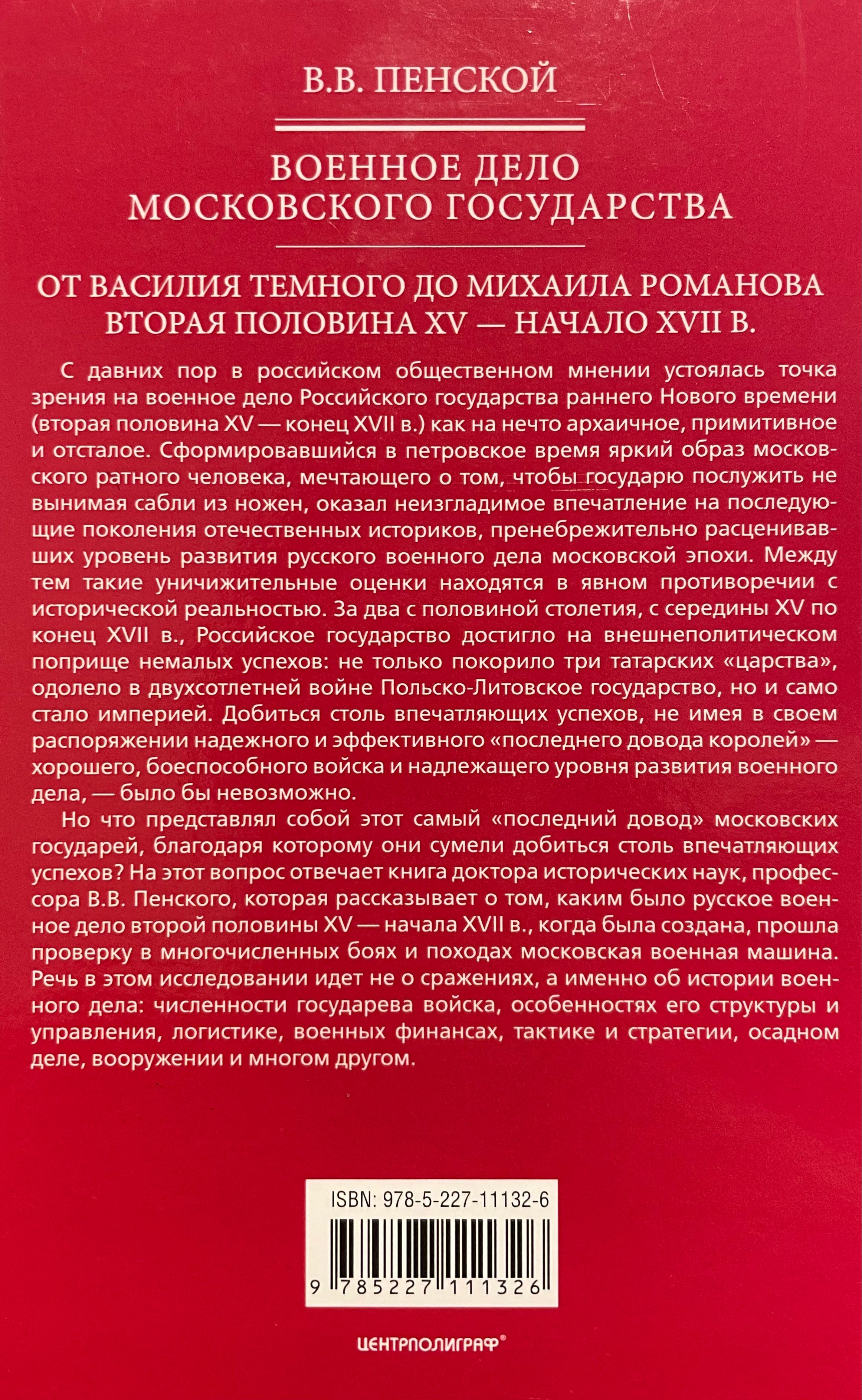 But what was this "last resort" of the Muscovite rulers that enabled them to achieve such impressive successes? This question is answered in a book by Doctor of Historical Sciences and Professor V.V. Pensky, which explores Russian military affairs from the second half of the 15th to the early 17th centuries, when the Muscovite military machine was created and tested in numerous battles and campaigns. This study focuses not on battles, but on the history of military affairs: the size of the sovereign's army, the specifics of its structure and command, logistics, military finances, tactics and strategy, siege warfare, weaponry, and much more.