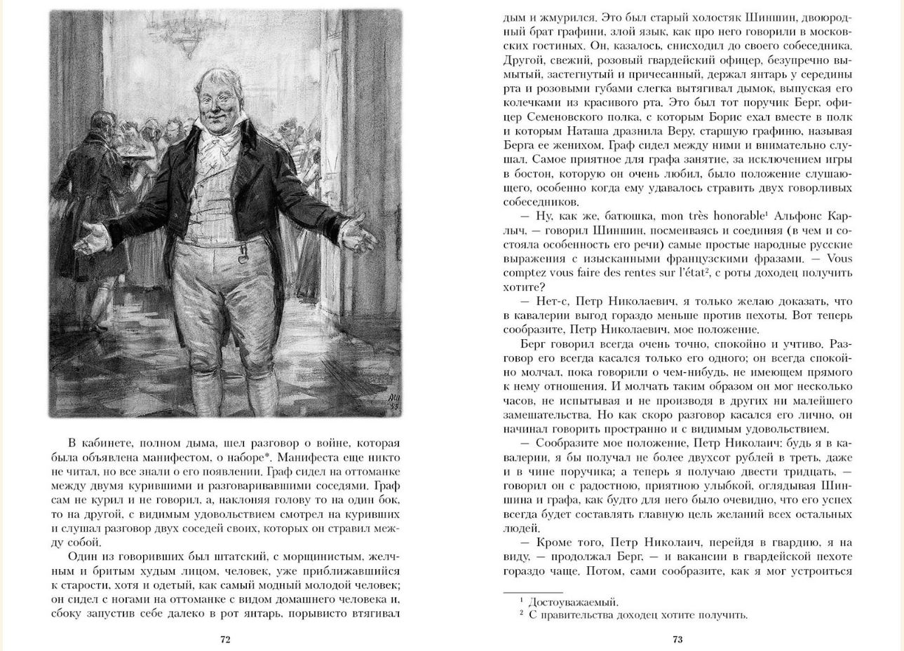 With his novel War and Peace, L. N. Tolstoy created a grand literary canvas about Russia at the beginning of the 19th century. A detailed chronicle of the lives of several noble families, large-scale battle scenes, an accurate portrait of society with its ideology, philosophy, and everyday life - in all the details of the novel, researchers recognize the author's "highest artistic objectivity". The writer studied the Russian character using several hundred characters as an example. Some of them are historical figures, while others are based on prototypes, including members of Tolstoy's own family. The writer used an incredible number of historical sources, archival materials, family legends, and memoirs, from which an entire library was assembled. With this edition, the classic illustrations of Dementiy Alekseevich Shmarinov, which are part of the golden fund of Russian book graphics, return to the reader. Incredibly alive, as if drawn from life, they are in amazing harmony with the text of one of the central works of world literature.