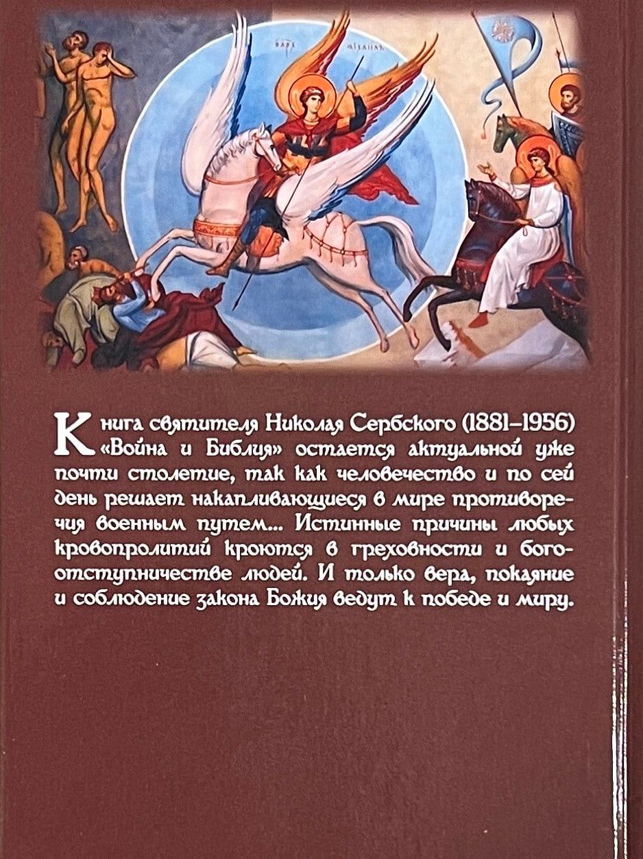 The work War and the Bible (1932) by St. Nicholas of Serbia (Velimirovic), written between the two World Wars, is devoted to the attitude of Christianity toward war. St. Nicholas says that the outcome of every war is decided by God and that all ancient and modern wars can be understood and explained only in the light of the Bible. Reflecting on the causes of wars in general, the author writes: "...man's war with man is the fruit of man's war with God." St. Nicholas concludes that defeat in war is the result of sin and the departure of the people, rulers and military leaders from God, while piety and good morals of all of the above lead to victories and peace. This work by St. Nicholas (Velimirovich) will be useful for the widest range of Orthodox readers.